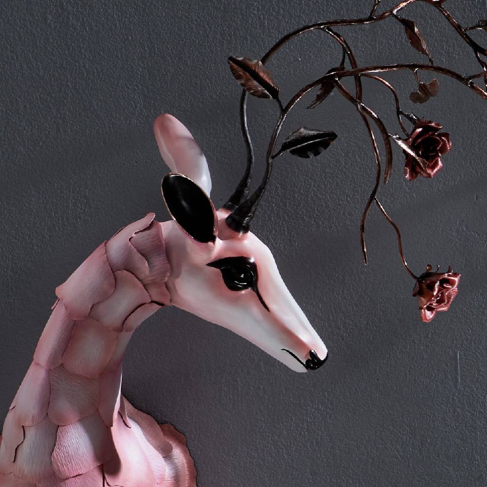 • 鹿與花的交織,展現自然與心靈的對話。《思華》低首內省,將盛放的華麗收進心底;《望語》仰首凝視,如在傾聽花語的呢喃。兩者一靜一動,一收一放,既獨立又呼應。藉由玫瑰的細膩與鹿的靈動,構築介於真實與幻想之間的詩意場域,邀請觀者在對望中感受情感的流動與自然的呼吸。