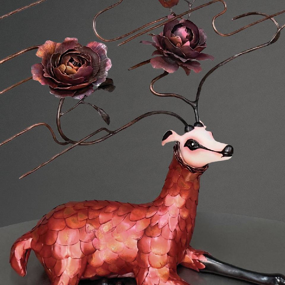 鹿的跪臥,並非單純的靜止姿態,而是一種放鬆與沉澱。牠放下了奔跑和警覺,與自然同頻。這份「靜」中,藏著生命對於休息與內省的渴望。「夢」是鹿和牡丹之間的橋梁,讓靜臥的鹿與盛放的牡丹交會在同一個空間,形成一種現實無法長久,卻在夢中得以永恆的對話。在牡丹與鹿的交織中,夢境成為保存美好與脆弱的容器,邀請觀者感受時間、美與寧靜是否只能在心靈的夢境裡長存?