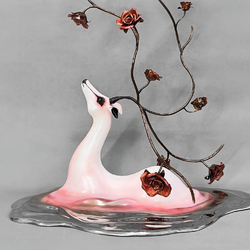 鹿昂首於水面中,角化為枝蔓,綻放玫瑰。它的凝視,彷彿正傾聽花語——一種無聲卻深沉的心靈對話。當兩者在倒影中交織,虛實不再是界線,承載靈性與純淨,是一種對生命的回響。每一道倒影,都是自我與自然的對話。「鏡中鹿-花語」如同一首靜默的詩,邀請觀者在凝望中,聆聽內心深處的聲音。