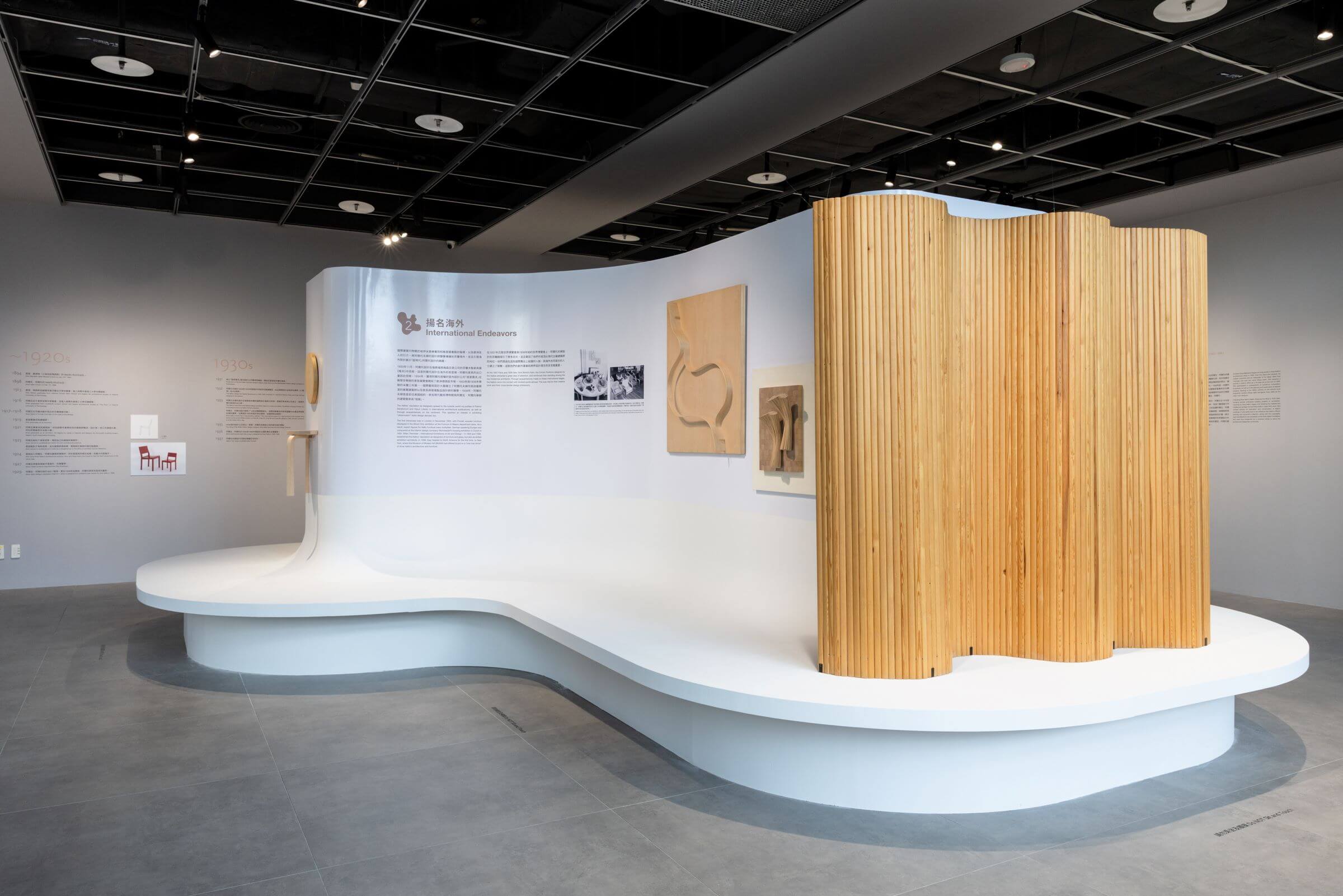 阿爾托夫婦在建築創作中不僅關注空間形式,也透過材質與細節的實驗,賦予生活空間質感與感知體驗。衛星展區呈現他們事務所成立初期面對20世紀工業化浪潮下,家具設計的創新實踐,挑戰傳統木作技術,發展膠合板曲木工藝,突破木材彎曲極限,打造輕盈有機且具量產可能的家具。在1934至1965年間,阿爾托更以七項專利展現家具實驗技術突破,成為北歐現代家具發展的重要典範。