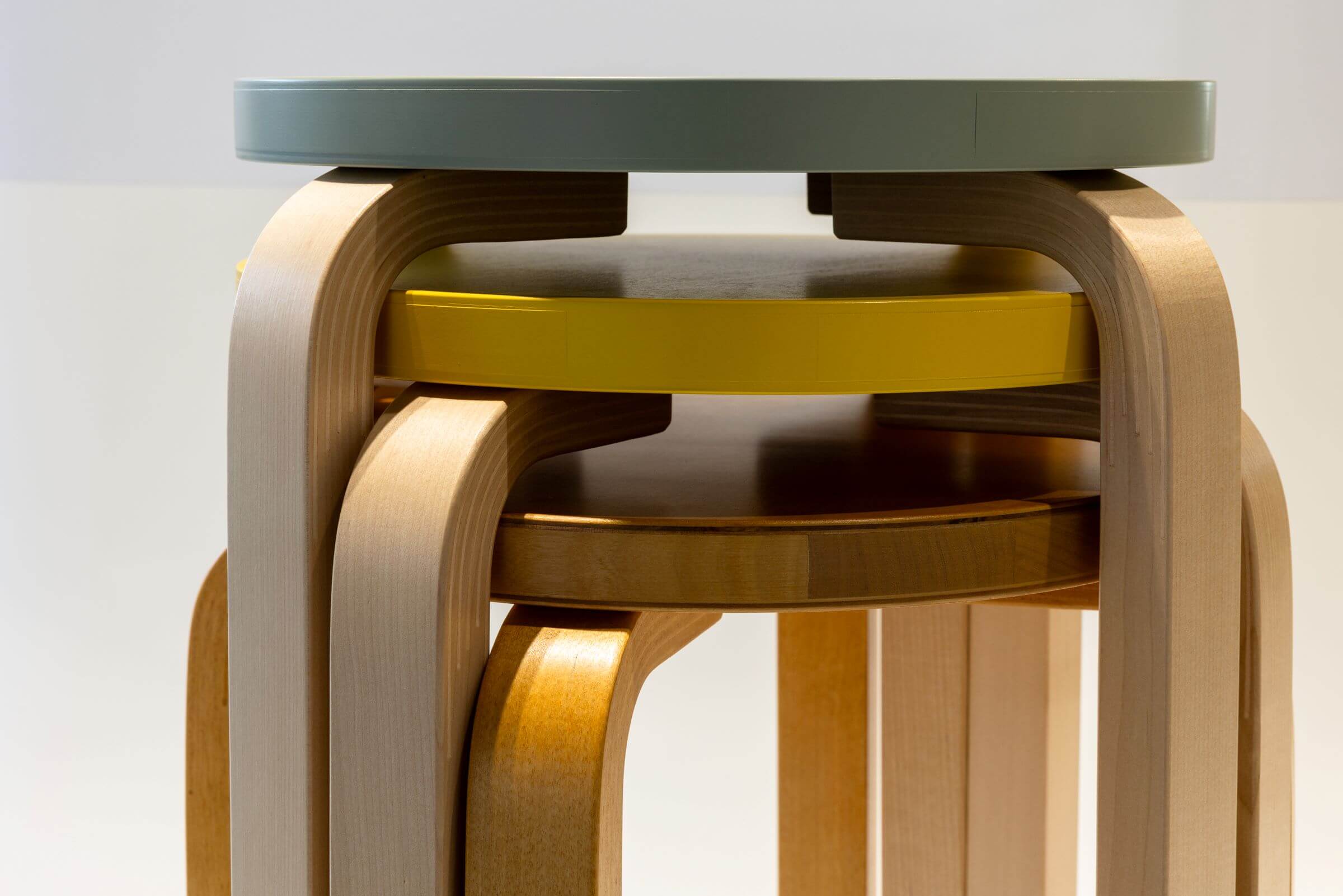 被譽為「圓凳之王」的60號圓凳,採用專利曲木技術打造L型支撐腳,三腳結構即使在不平表面也能保持穩固,且可堆疊收納節省空間。其簡潔的木質平面易於清潔,完美展現功能主義精神;而L型支撐腳亦持續衍生出Y型、X型、V型等多樣變體,成為品牌經典的設計語彙。
