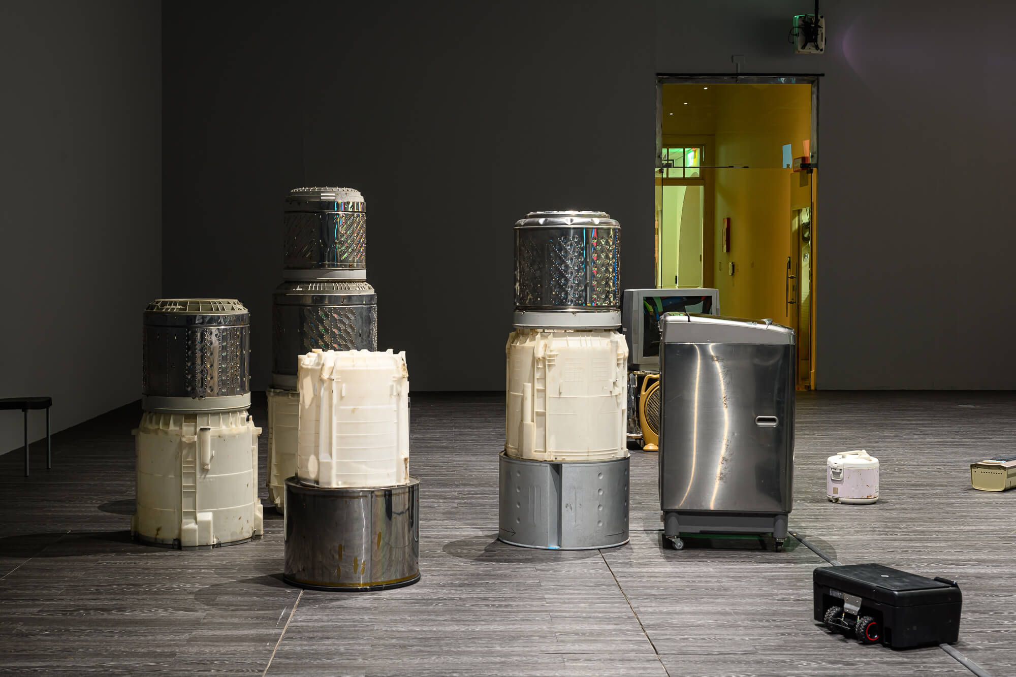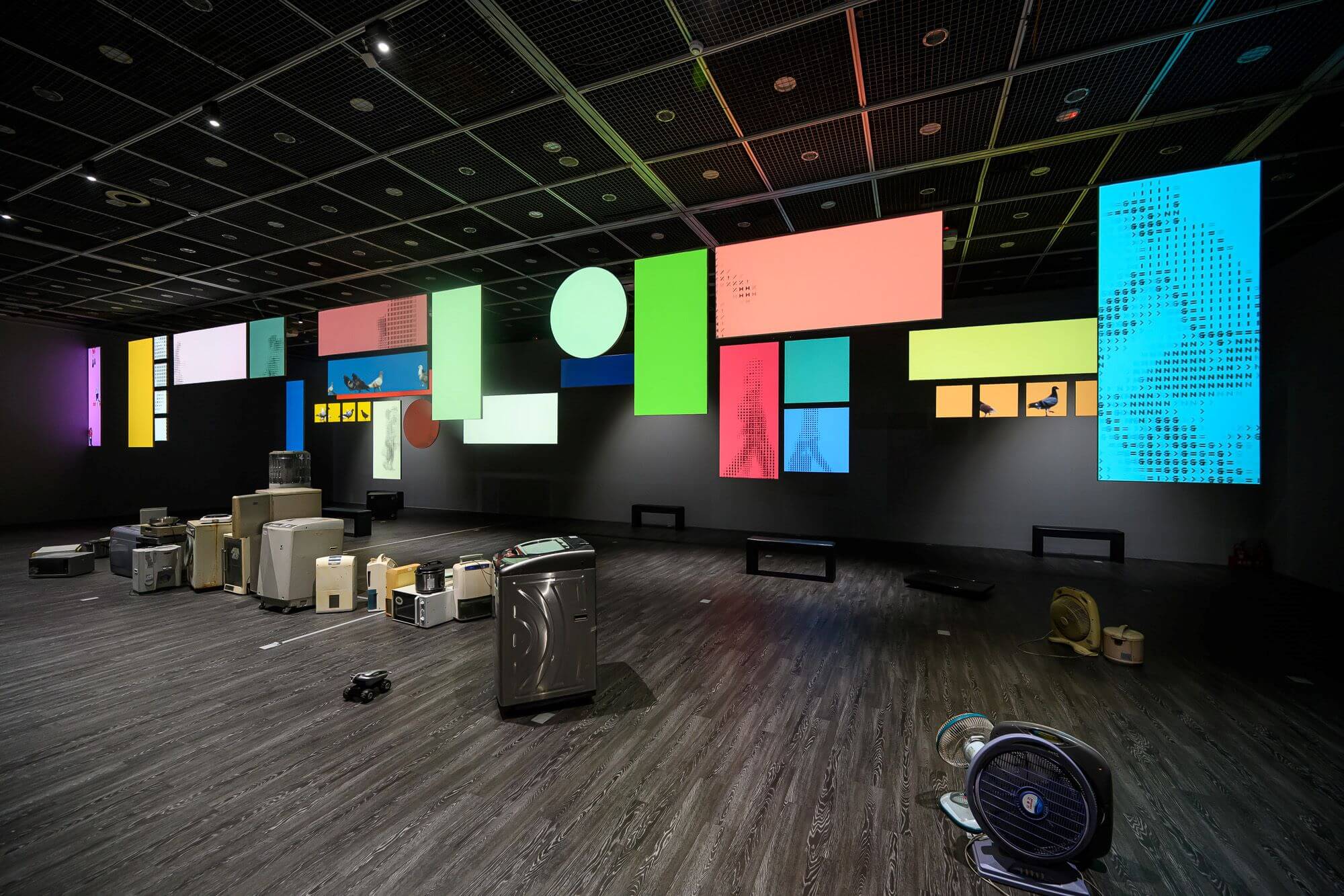 在展覽的尾聲,陳萬仁《這不是一個幌子》與廖建忠《運転生活終點站 3.0 K-us》共同佔據當代館動線盡頭的開放大廳,空間忽然開闊起來。前面多是細微而貼近的感官經驗,到了這裡則像被邀請鬆開手腳,用身體去穿梭、繞行、停留。人影在招牌之間游移,家電在地面滑行,實體裝置與觀者的感知相互牽引,持續位移。開放空間被妥善運用的同時,策展策略上也將感性最大化的展開——層次既存在於意義上,更體現在身體經驗的飽滿感。走到這裡,能清楚感受到《No Language》的感性同時作為編排與感知,是如何在不同尺度之間轉換:從耳語般的細節延伸到足以佔滿全場的場景。而在陳萬仁作品中短暫閃現的鴿子影像,讓這場感性部署的收尾帶著一絲熟悉的回聲。