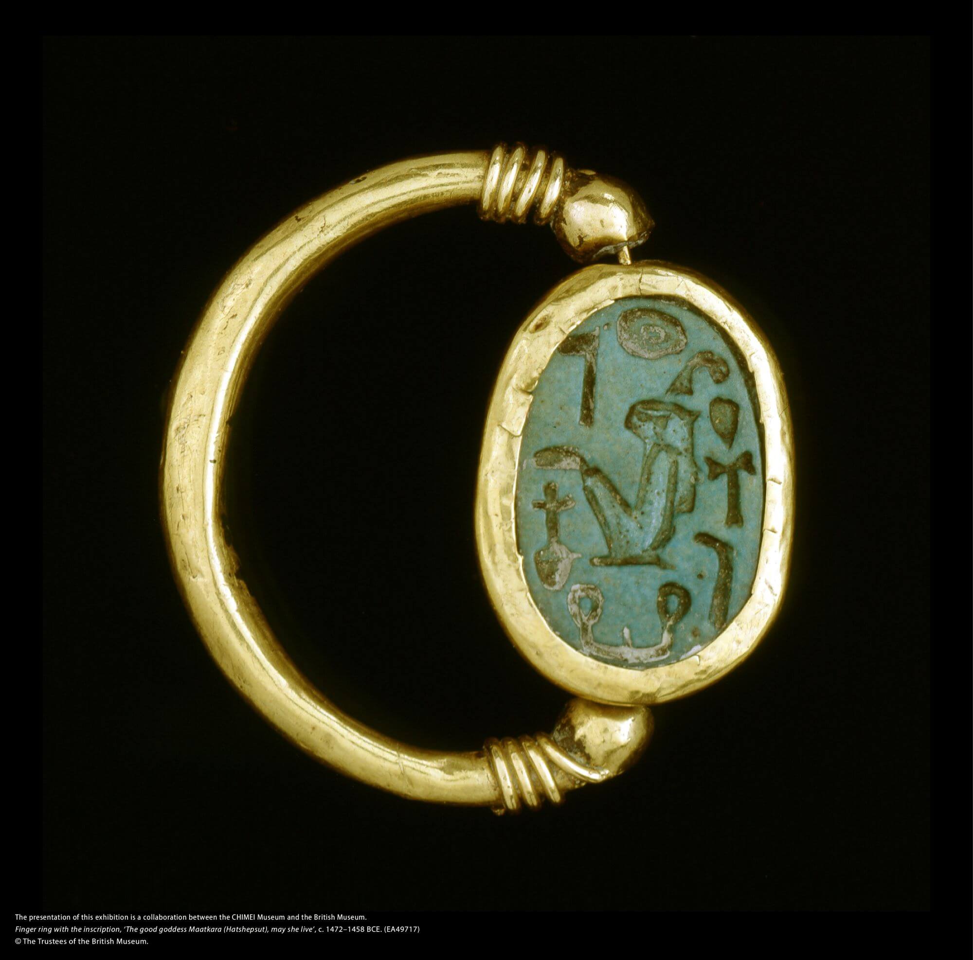 戒指銘文「善良的女神瑪特卡拉(哈特謝普蘇特王位名),願她永生」,約西元前 1472–1458 年。圖/大英博物館理事會。