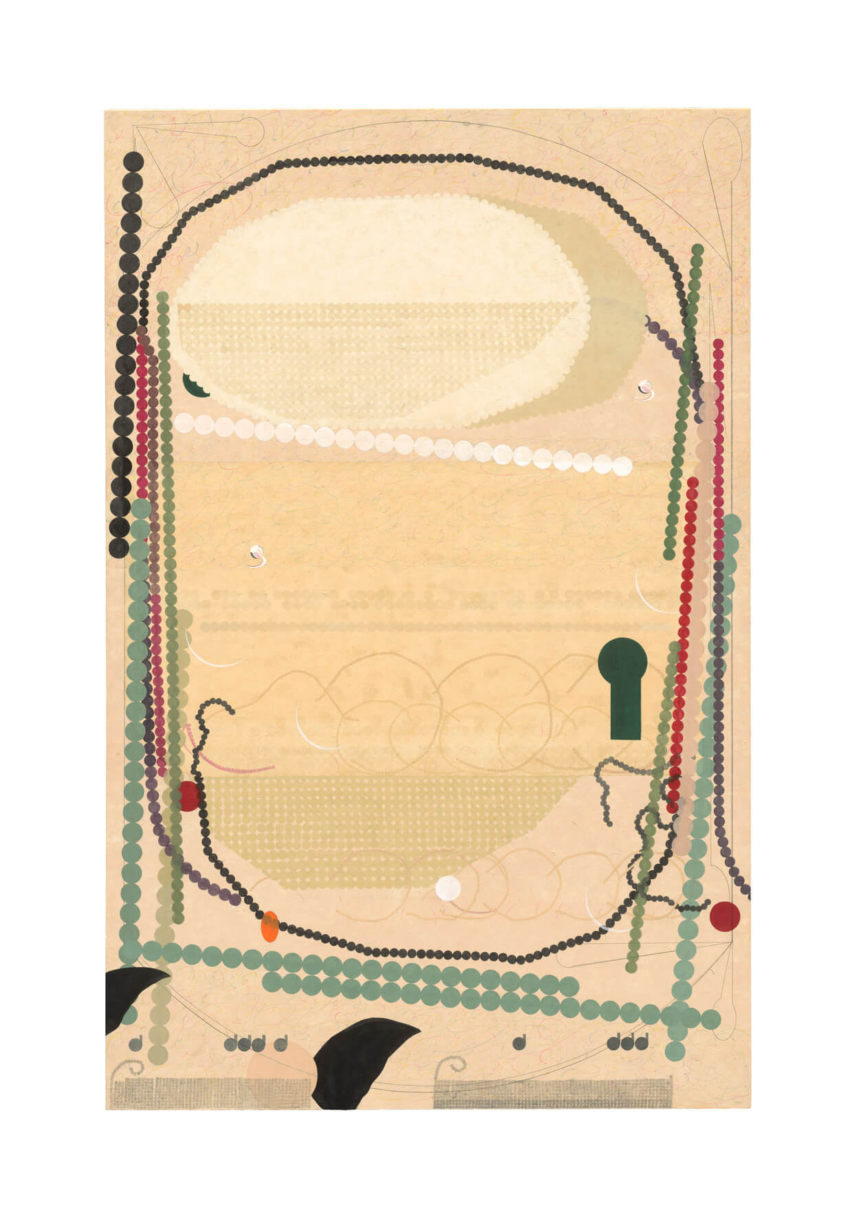 韓國藝術家 Lili Lee(1993-),其作品〈心中有心〉(2025)以細緻的圓點與線條結構,來呈現緩慢、神秘、內斂的內在節奏。淺褐、淡綠與褚紅的顏色調和成一幅心靈的地圖,跟隨著這些弧線的指引,我們的注意力彷彿將被帶往意識的循環與能量的流動。藝術家延續她對韓國薩滿信仰的興趣,將符號、護身咒與東方繪畫語彙結合。創作過程近乎冥想,如一種將精神凝聚在畫筆的行動,使畫面在靜止中保持呼吸。