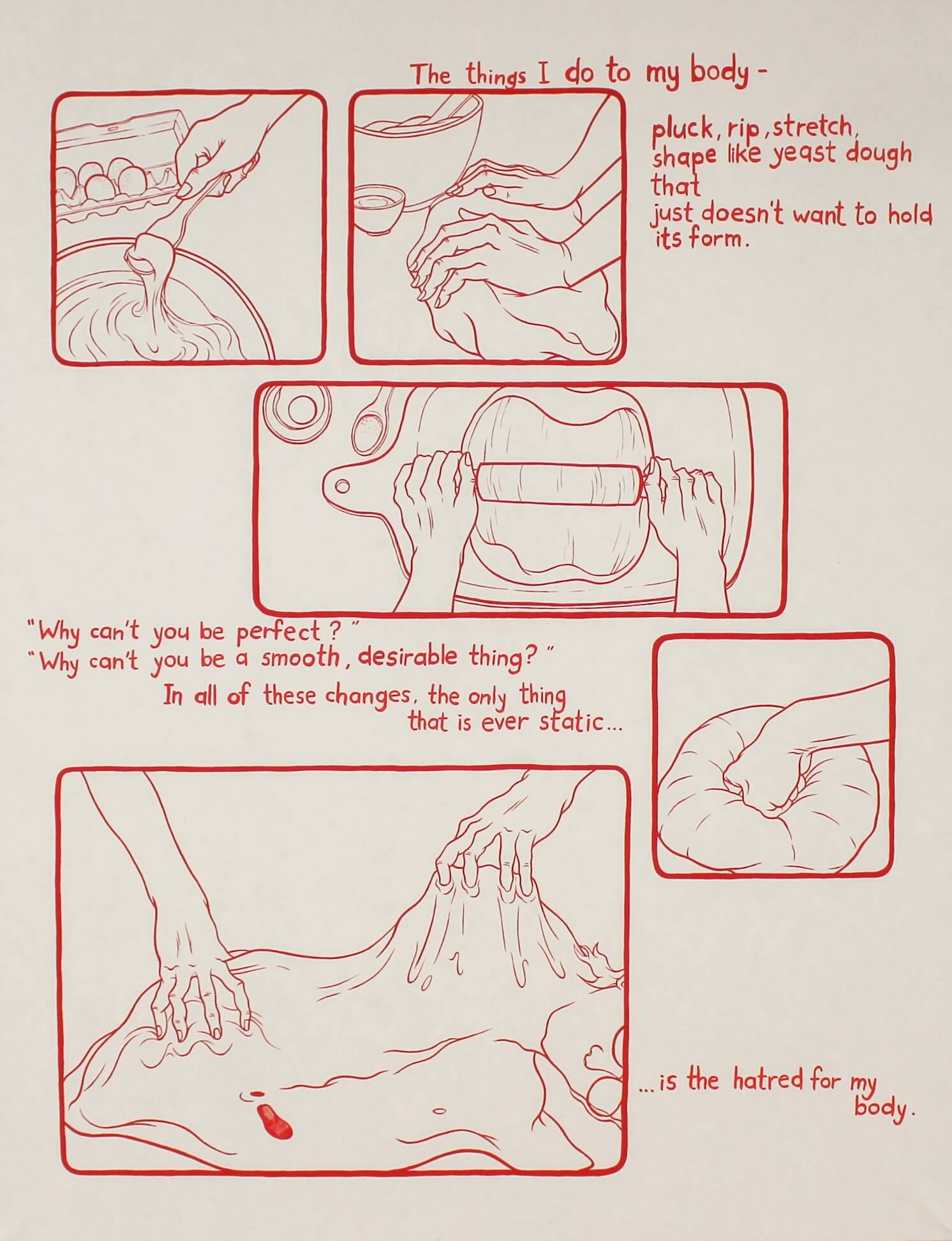 作品中對麵團揉捏、拉扯、拍打的動作,象徵對身體的塑形與懲罰,文字則是那些不斷在腦中迴響的自我審判:「為什麼你不夠完美?」、「為什麼你不能成為被渴望的對象?」Nelson Hor 指出了男同志社群內部的隱痛——因為主流「天菜」形象的不可企及,而產生的身體焦慮與自我厭惡。藝術家的視覺寓言,顯示真正的壓迫和歧視,往往來自社群內部,而非外部社會。礦物顏料連結了人類最早的創作衝動與當代的精神創傷,它們在輕與重、慾望與羞恥、古典與流行的碰撞中,形成當代的自我告解。