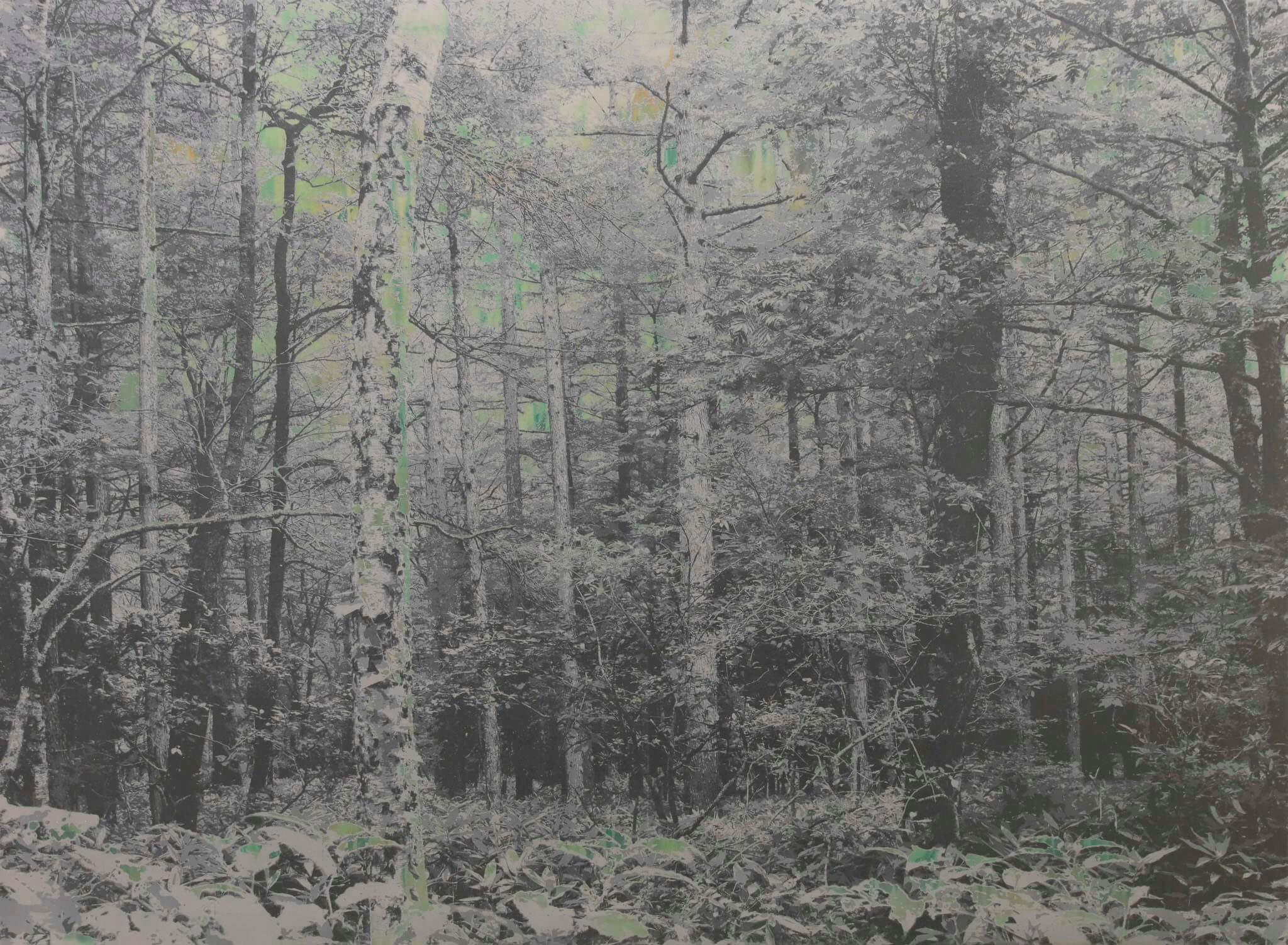 其中關注今年甫於台北舉辦個展完的日本藝術家能條雅由(Masayoshi Nojo,b.1989),其創作受到17世紀日本畫家尾形光琳利用銀箔表達時間流逝的手法啟發,圍繞對時間與記憶的追尋主軸,以金屬箔為媒材結合絲網印刷技術的獨道創作手法,令作品畫面呈現特殊的視覺氛圍與質感。而這樣的創作方式亦同時體現出對日本繪畫傳統的反轉。不同琳派、狩野派將金屬箔為作畫背景,能條雅由則反以箔片構成圖像整體,將傳統日本繪畫的裝飾語彙轉化為自身對於遙遠記憶的詮釋。《海市蜃樓》(Mirage)系列呈現以銀箔反覆堆疊出的森林景象,作品表面在光線照射下隨角度變化閃爍,猶如隨著時間流動而反覆變幻的記憶殘像。