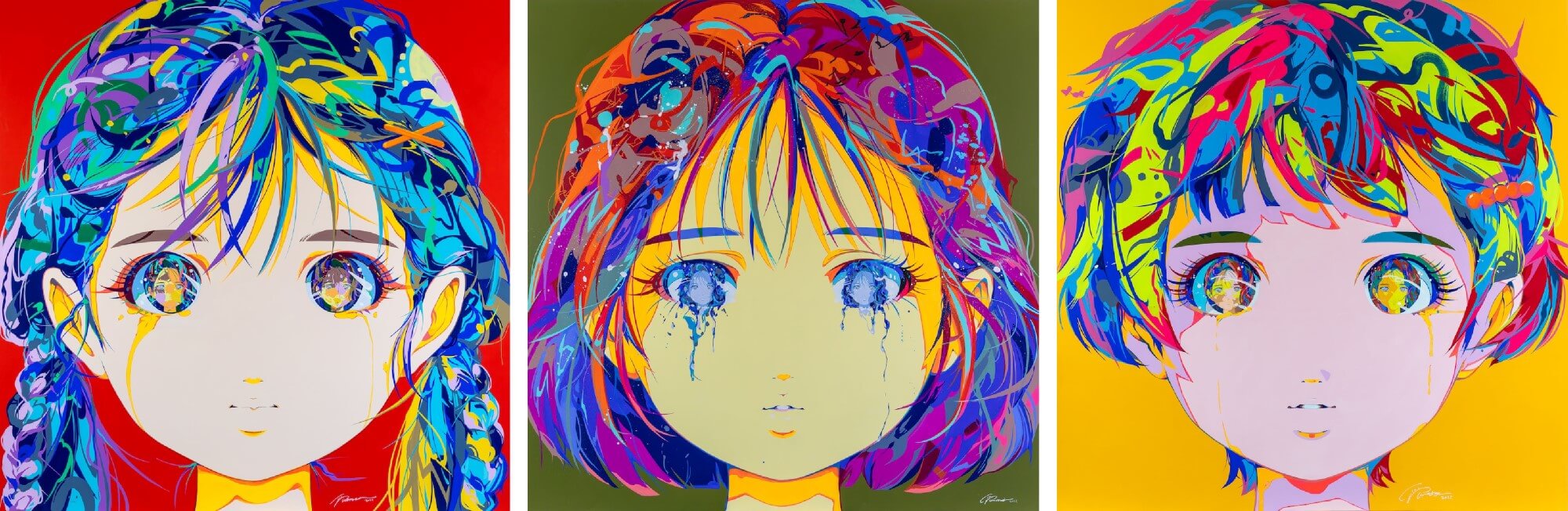 愛☆瑪丹娜,〈她的容顏,悄然淡出記憶 —— 花長椅・Shu〉(左)、〈她的容顏,悄然淡出記憶 —— 花長椅・藍〉(中)、〈她的容顏,悄然淡出記憶 —— 花長椅・Kiki〉(右),2025。壓克⼒顏料, 帆布畫,162 × 162 cm。圖 / Takeda Art Co.提供。