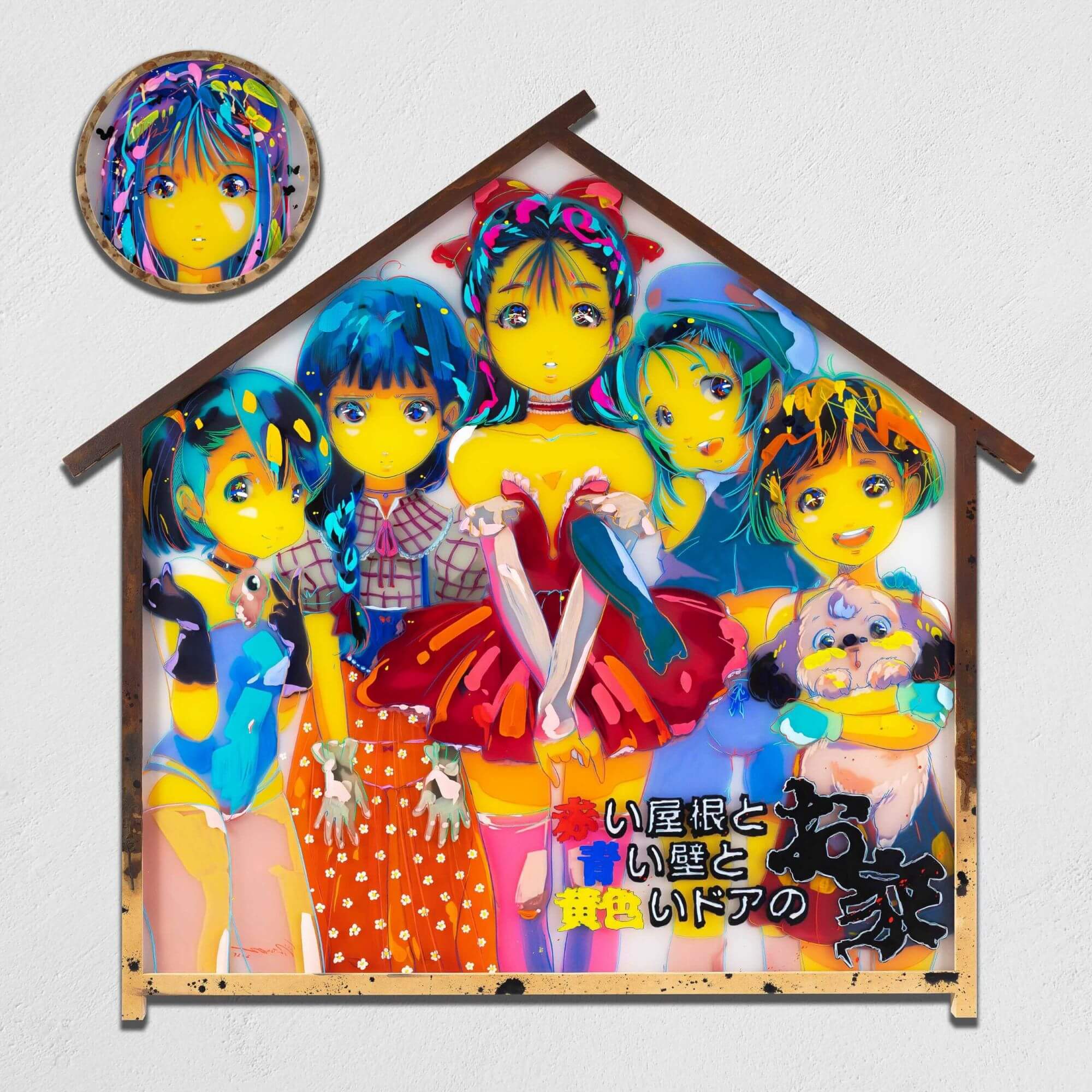 愛☆瑪丹娜,〈紅屋頂、藍牆壁、黃⾊⾨扉的家〉,2025。壓克⼒顏料, 油性鉛筆, 壓克⼒板,137.8 × 146.4 × 4 cm。 圖 / ART TAIPEI 2025、Takeda Art Co.提供。