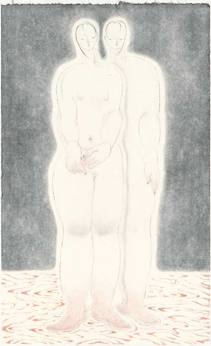 日本藝術家風能奈奈(1983-),其繪畫作品〈Page of Revelation from a Bird and Dizziness〉(2018),由兩幅並置的畫面構成兩頁展開的書卷形象,像是從神話典籍撕下的殘章。以黑與土灰為基調,多重的視角,帶著中世紀繪畫般的觀看方式。色彩雖簡約,卻散發一種莊重的儀式氣息。然而,這種儀式並非宗教的崇高,而是對日常潛在秩序的敏銳感應,一種靈知(gnosis)的體驗。左側的人、獸與半人半獸在曖昧的樹林間起舞,蛇纏繞在樹上,水晶在陰影中閃爍,那是一種來不及被語言紀錄的記憶,在生與死、誘惑與再生的邊界之間閃現。
