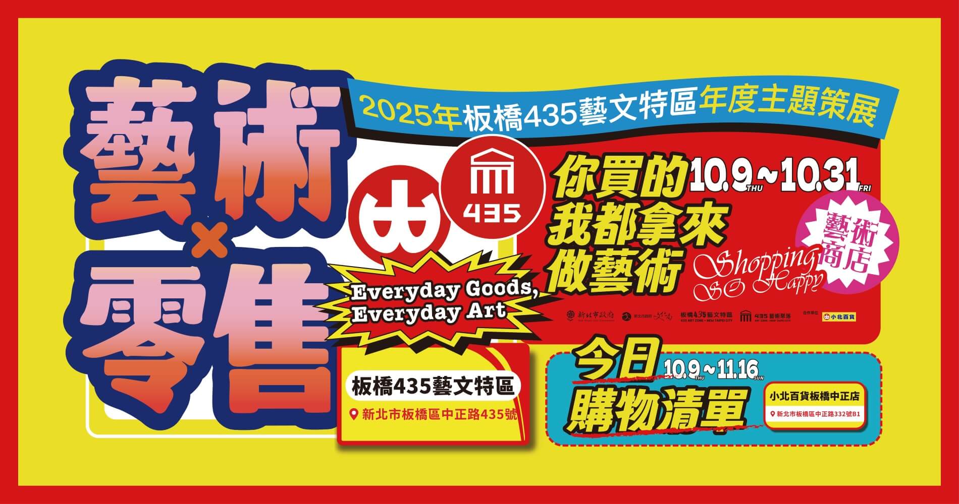 藝術不只存在於美術館,也能在日常消費中萌芽!板橋435藝文特區推出2025年度主題策展《藝術 × 零售》,即日起至10月31日止,邀請民眾以購物、陳列、展示的角度重新想像藝術與生活的關係;相關展覽《今日購物清單》,於「小北百貨板橋中正店」同步展出至11月16日,串聯藝術空間與商業通路,打造跨界合作的全新展覽體驗。