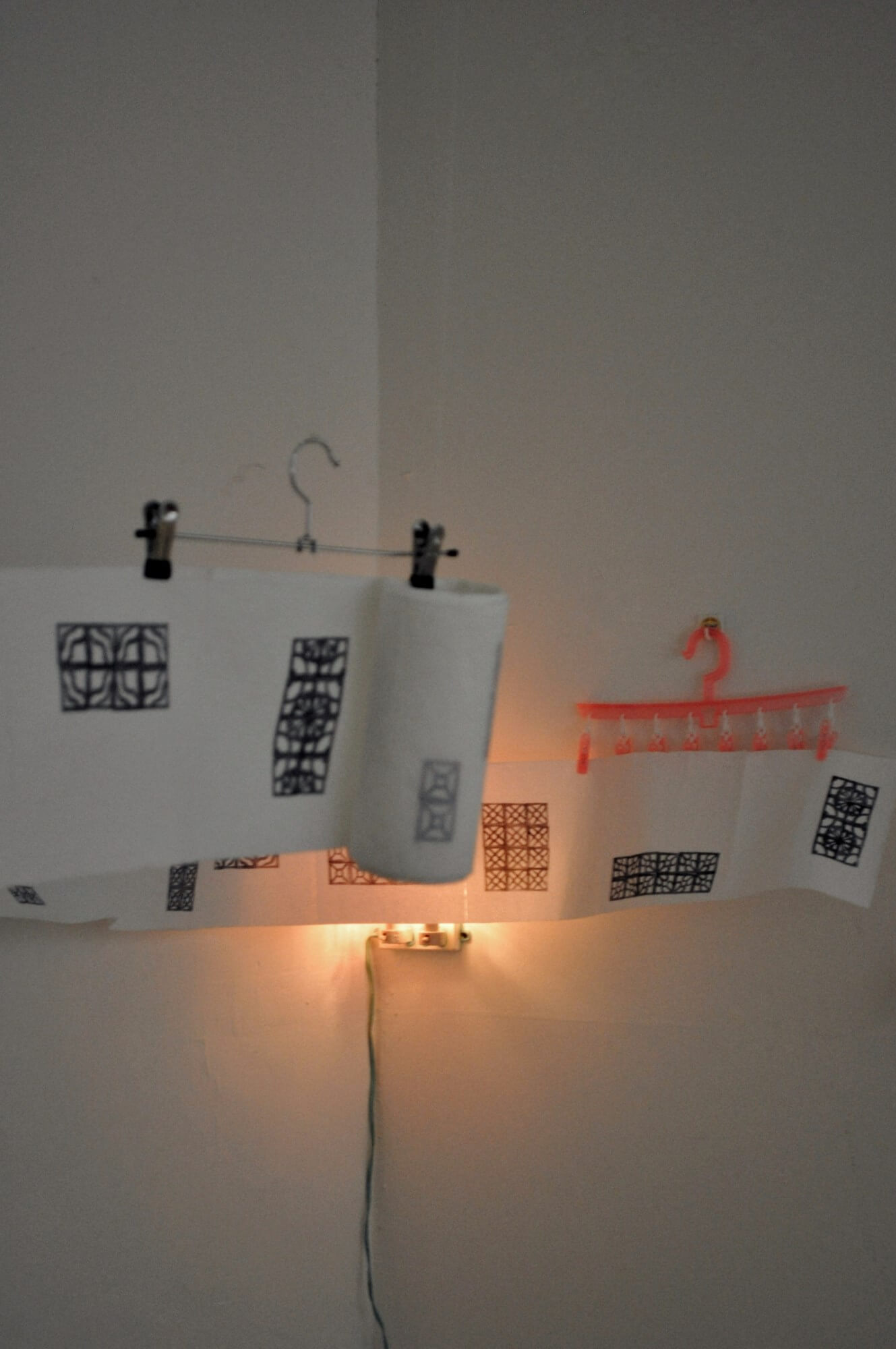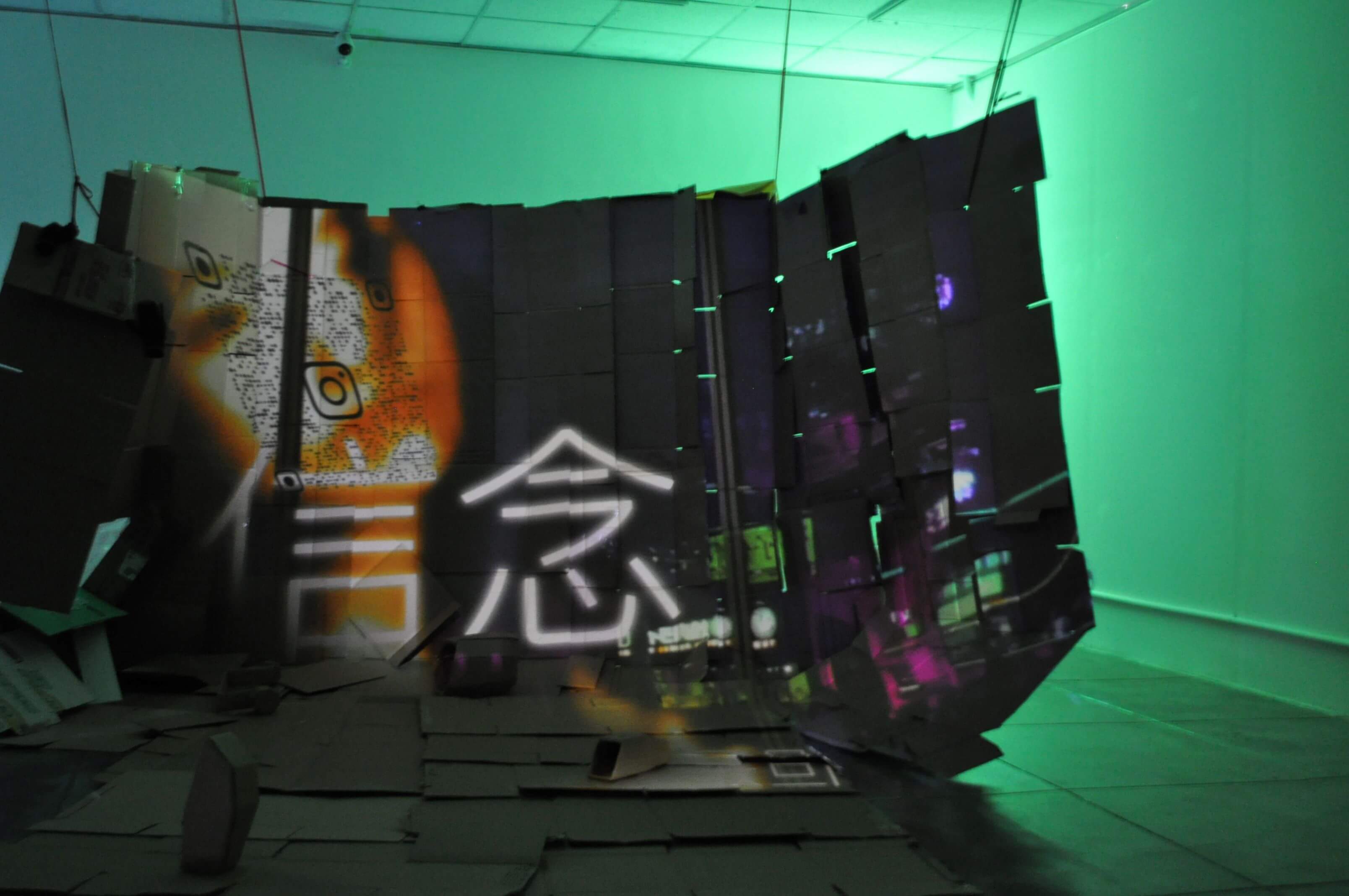 藝術家鍾佳陵以商店紙箱為投影背景,呼應影像裡在城市游移的紙箱恐龍人。圖/板橋435藝文特區提供