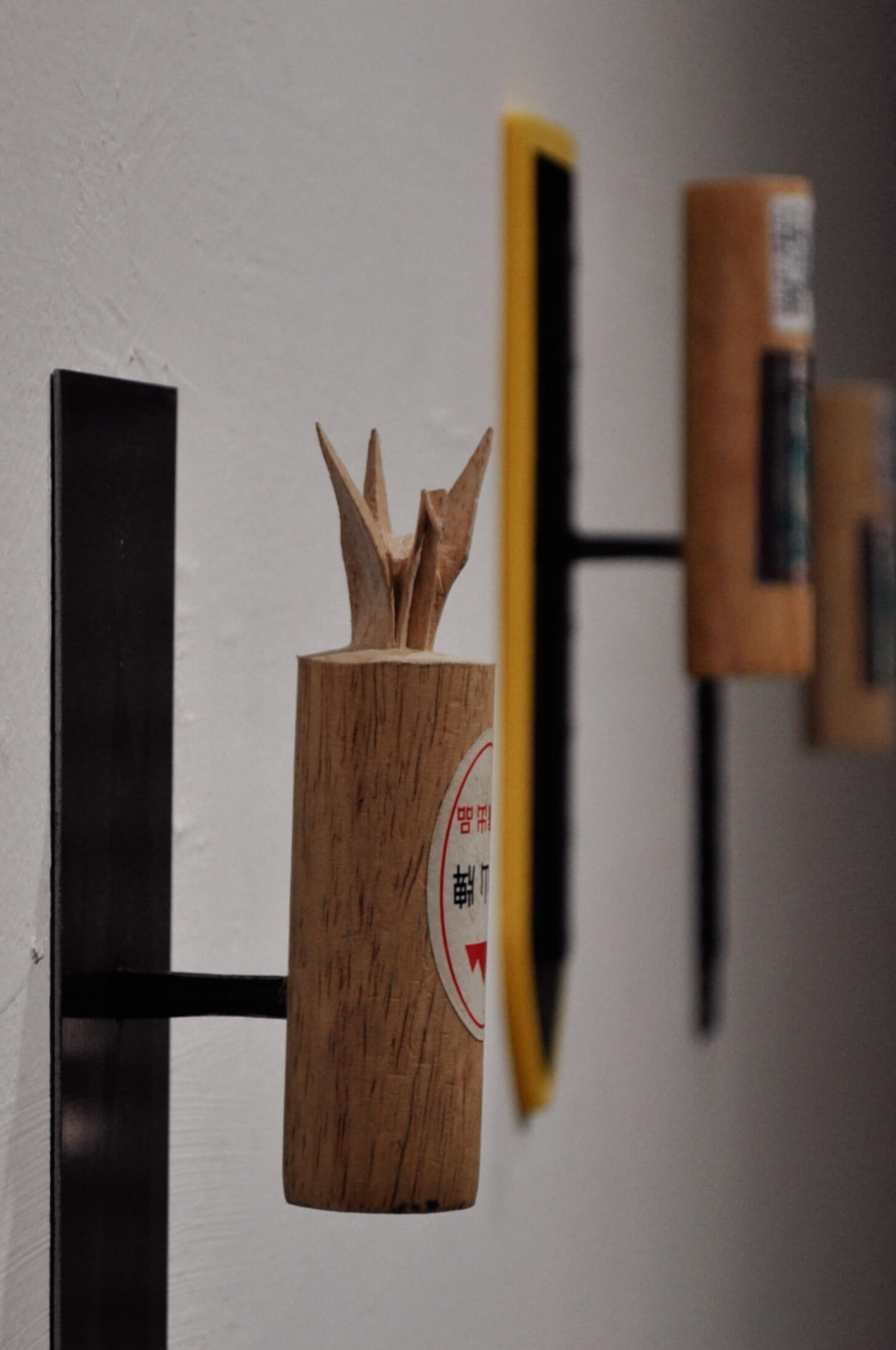 藝術家周學涵將水泥抹刀的木柄雕成紙鶴,呈現工具與創作的對比趣味性。圖/板橋435藝文特區提供