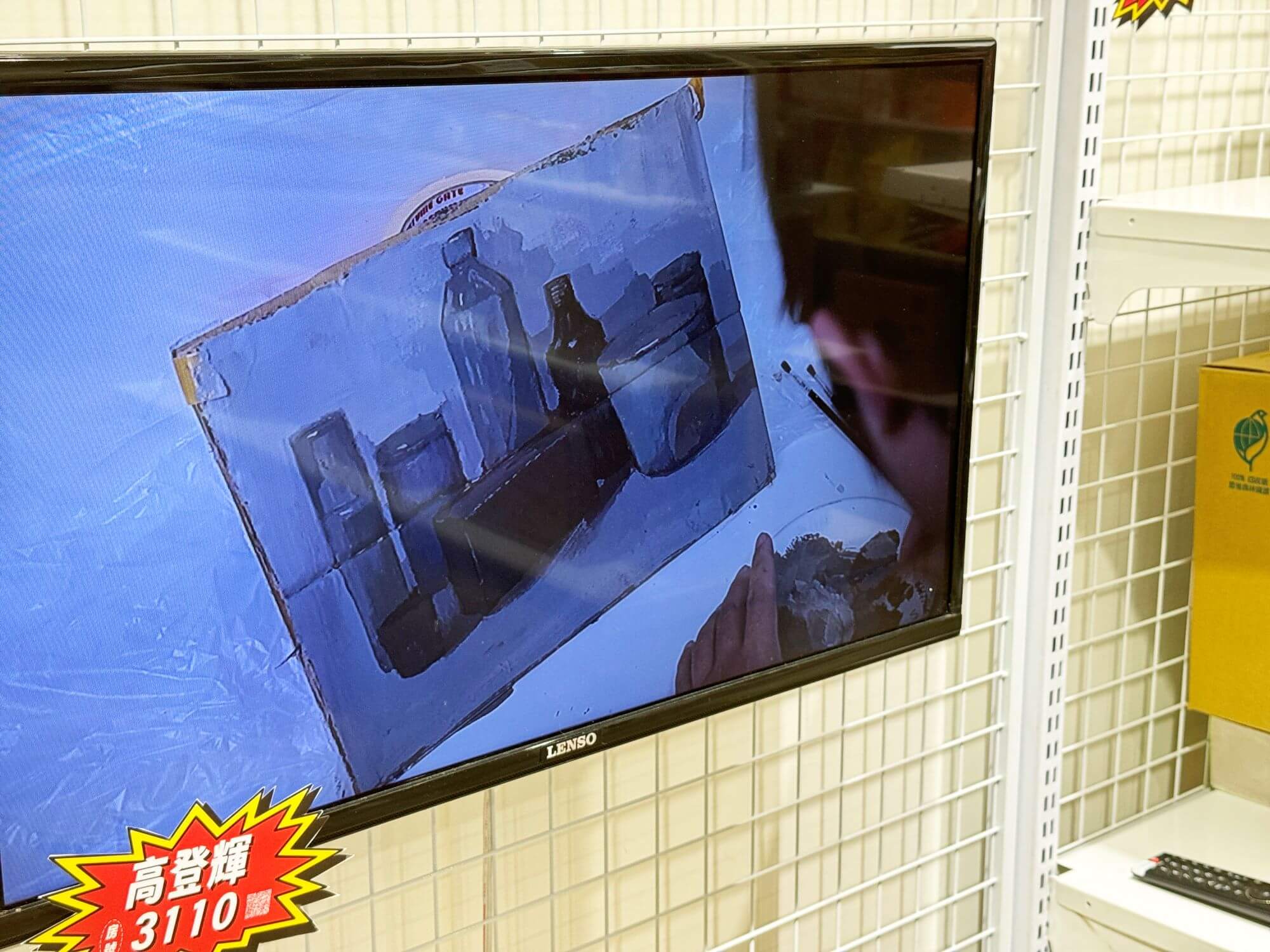 藝術家高登輝運用商品作畫,並錄製「靜物畫教學影帶」循環播放,揭示商品具備藝術與美術教育潛能。圖/板橋435藝文特區提供