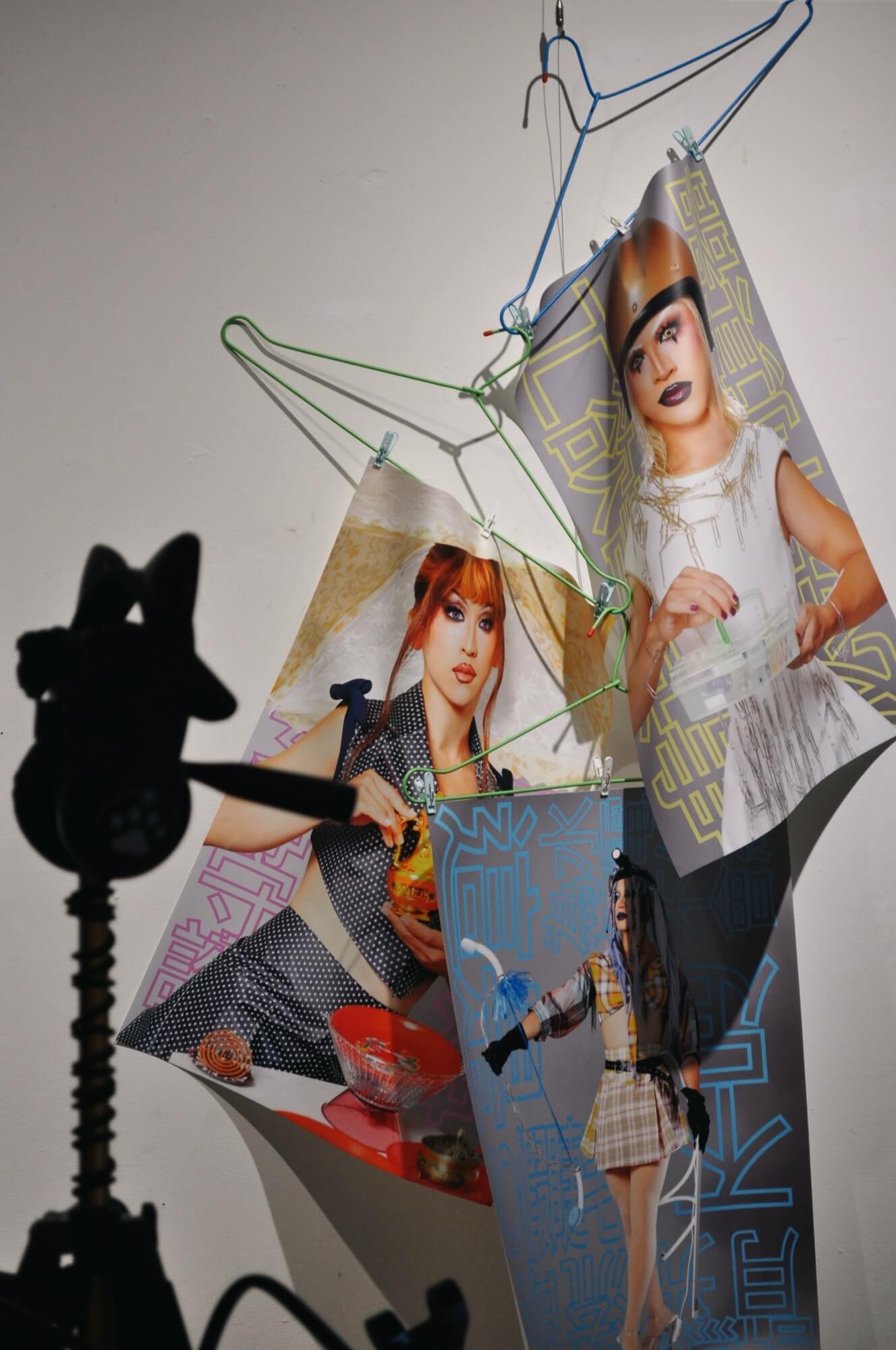 藝術家簡詩翰化身各項物品的神話女神,進而探討代言人對消費的影響。圖/板橋435藝文特區提供