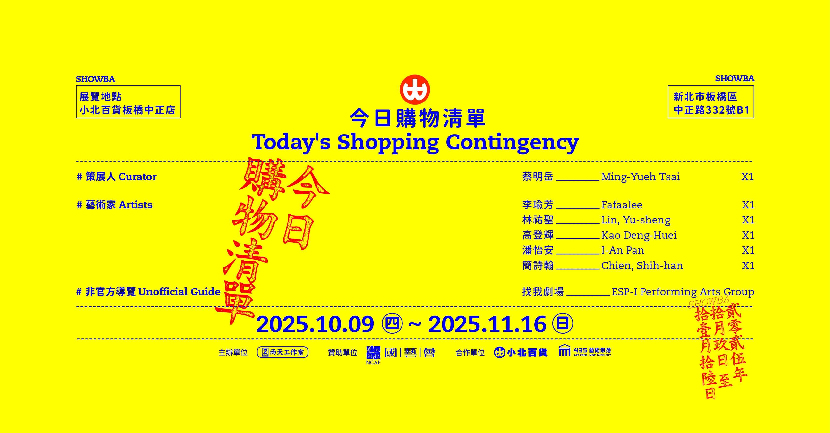 策展人蔡明岳將商場視為實踐藝術的場域,於小北百貨板橋中正店策劃展覽《今日購物清單》,讓民眾在採買日用品的同時,也能「偶遇藝術」,邀請民眾走進商店與展間,探索日常商品與藝術創作的新關係。