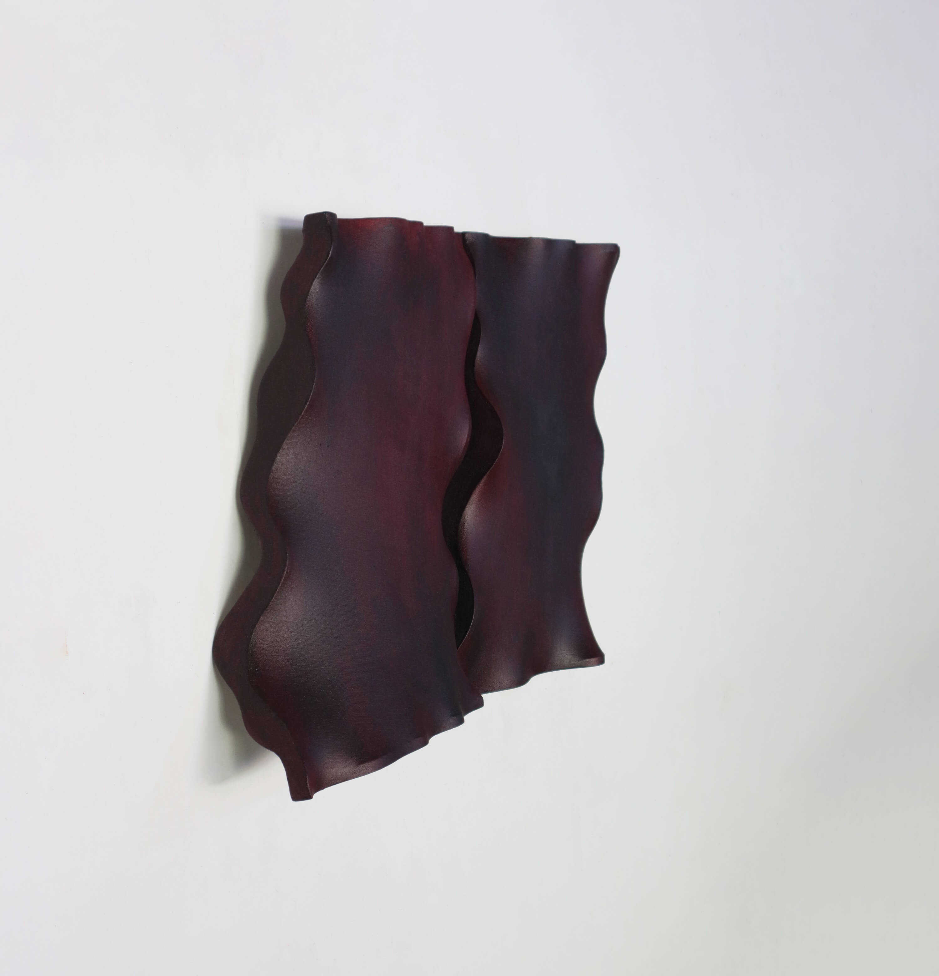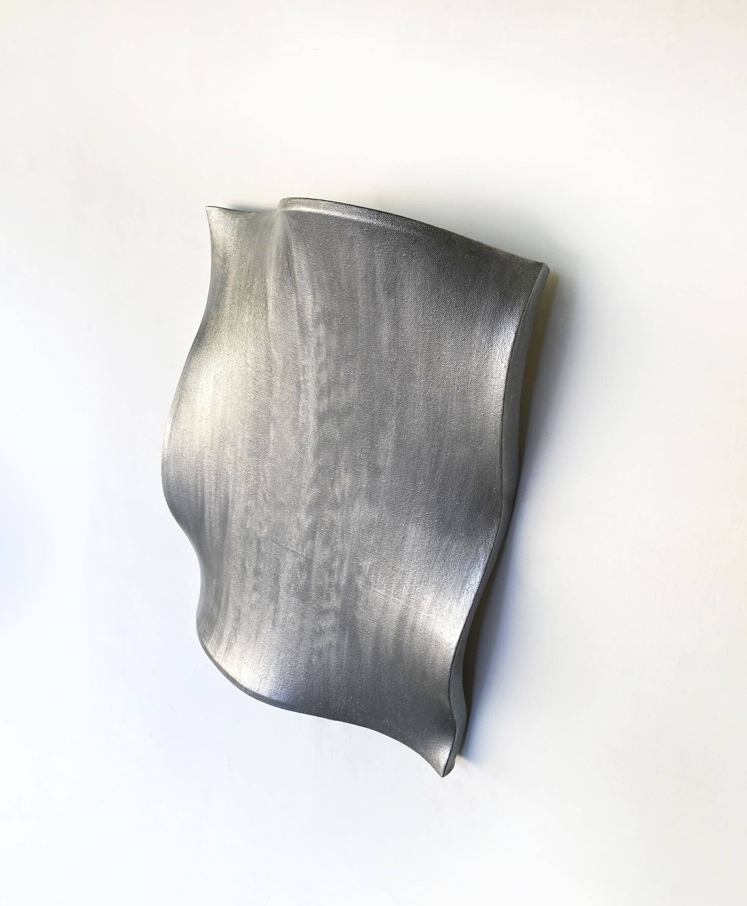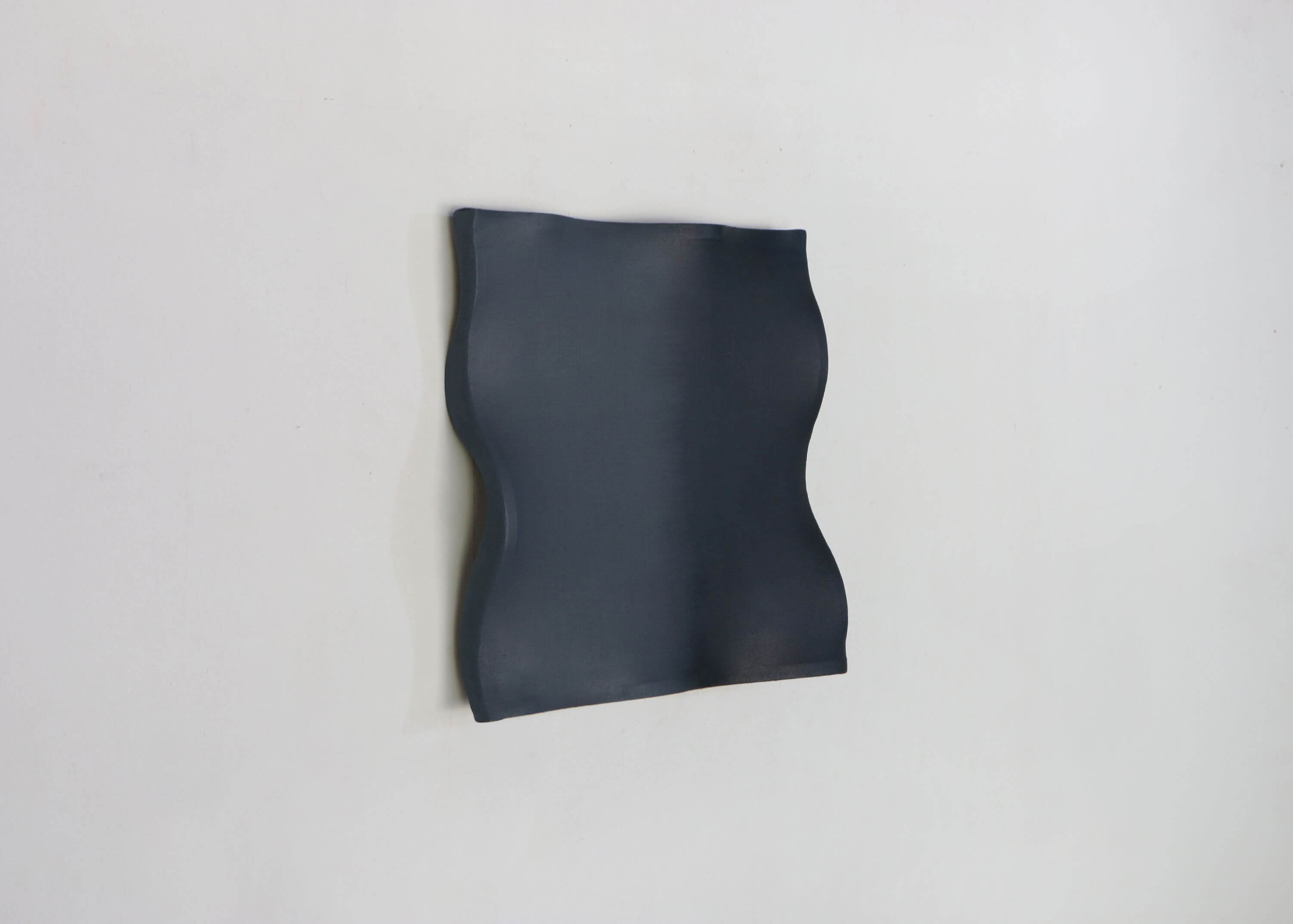在《靜⾊微光》中,這樣的關注被具體化為⼀種「模糊的語法」。作品以錯位、拼接與流線形構成,彼此之間留下可⾒的縫隙與不確定性,這些空⽩既是界線,也是呼吸。蔡亞克以傳統繪畫媒材為基底,卻以雕塑的⽅式形塑畫布,使之同時擁有繪畫的肌理與雕塑的姿態。光影的推移在作品表⾯形成連續的節奏,如同時間在畫⾯上留下的柔軟摺痕。
