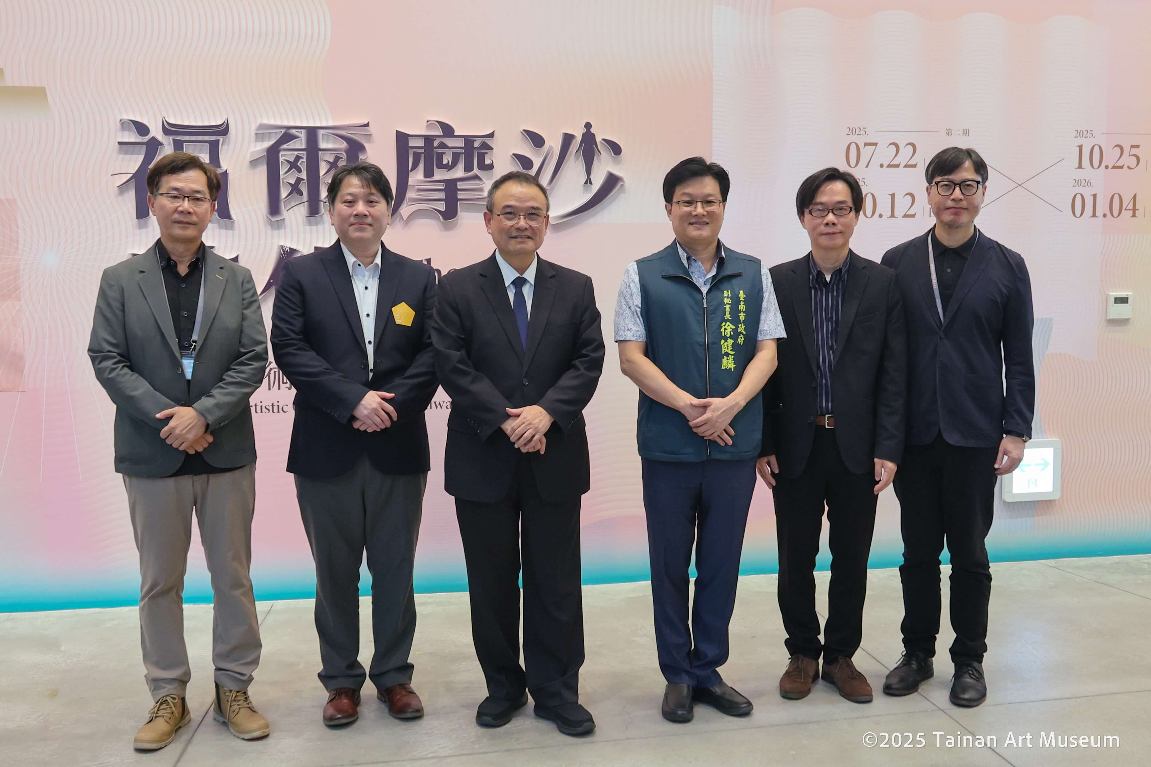 (左起)南美館館長龔卓軍、故宮書畫文獻處何炎泉處長、故宮蕭宗煌院長、臺南市政府徐建麟副秘書長、策展人白適銘及南國美黃宏文代理主任。圖 /臺南市美術館提供
