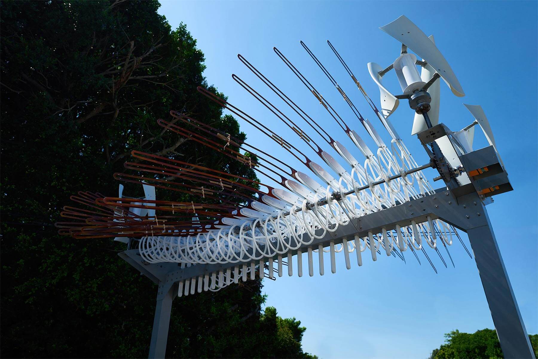 這件作品的起點來自他在紐約駐村期間對臺灣海風的思念。回到清水後,他被當地保育行動感動,決定以這件作品回應這片土地。觀眾以手機播放音樂,讓鐵件蟹螯隨節奏舞動;當旋律響起、風拂其間,那是一個脆弱卻真實的共感時刻——人與自然的距離,正隨聲音漸漸靠近。