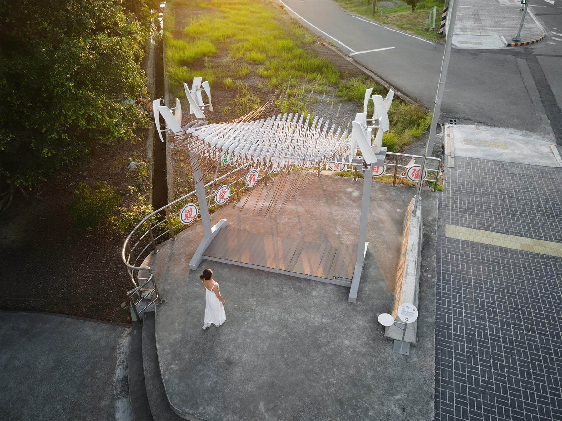 風吹來了變化,也帶來力量。清水長年受海風滋養,藝術家賴英翔的《風形之脈》率先捕捉這股能量。作品設於信義小站前的升旗臺,這座水泥平臺在他眼中像一個停機坪——專屬於風的舞臺。《風形之脈》以垂直軸風力發電為概念,當風吹過時,金屬結構隨氣流緩緩旋轉,像一場被看見的能量舞蹈。