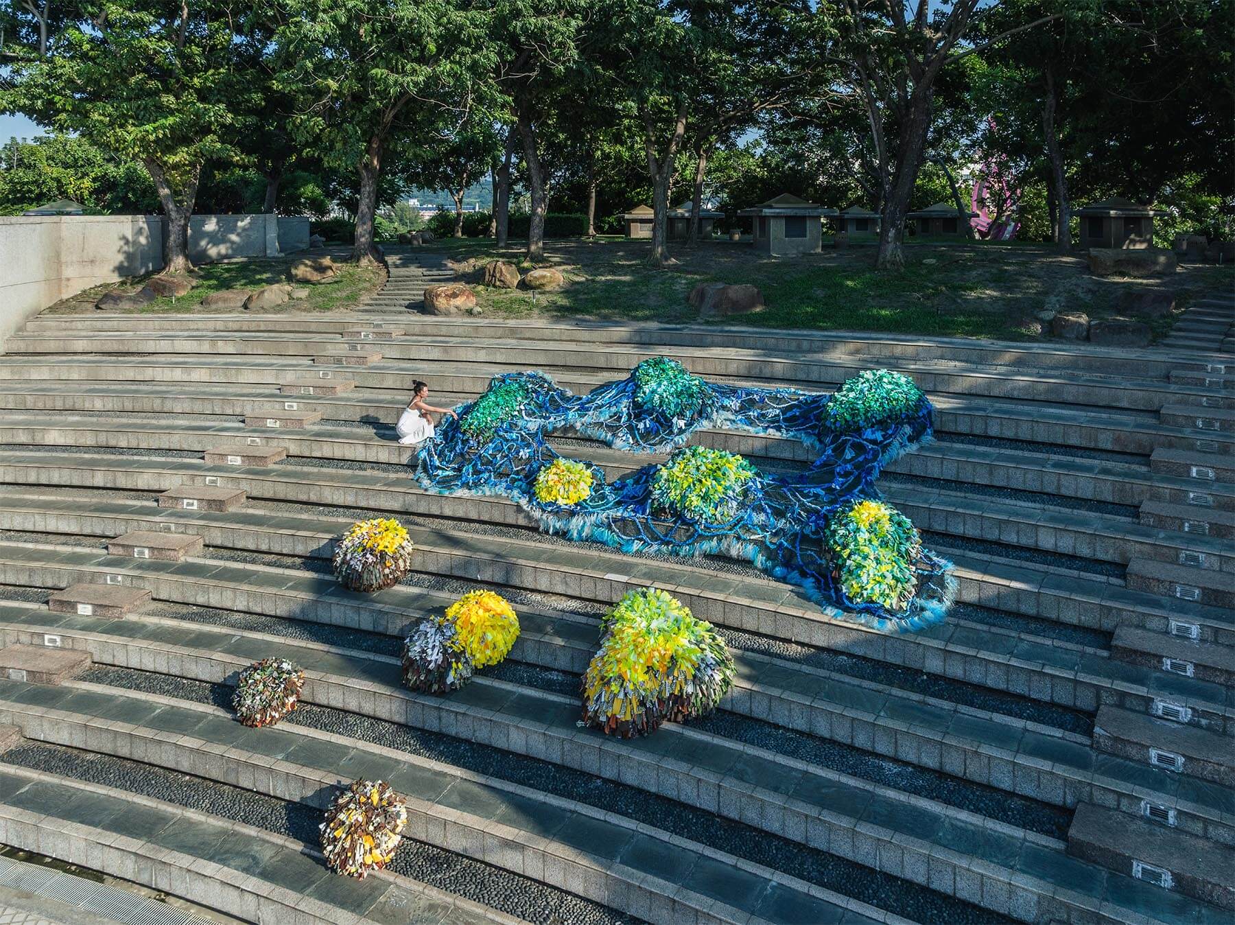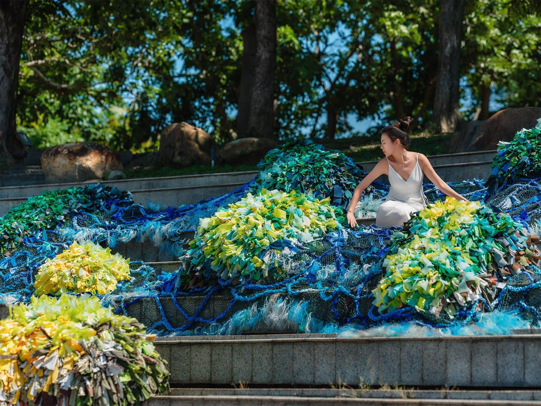 藝術家林資芬的《流變之景》以高美濕地為靈感,使用廢棄漁網與回收布條重新編織,讓海的形狀在陸地上延續。作品的核心是「觸感」。她以瀕危植物「雲林莞草」作為想像原型——這種生長於海陸交界的植物,從空中俯瞰,彷彿一片被放大的苔蘚。林資芬以回收漁網的纖維取代其質地,想像如果能親手觸碰,會是什麼感覺。作品安置於斜坡階梯間,形成漂浮般的不穩定感,也回應植物在氣候變遷下的脆弱生態。