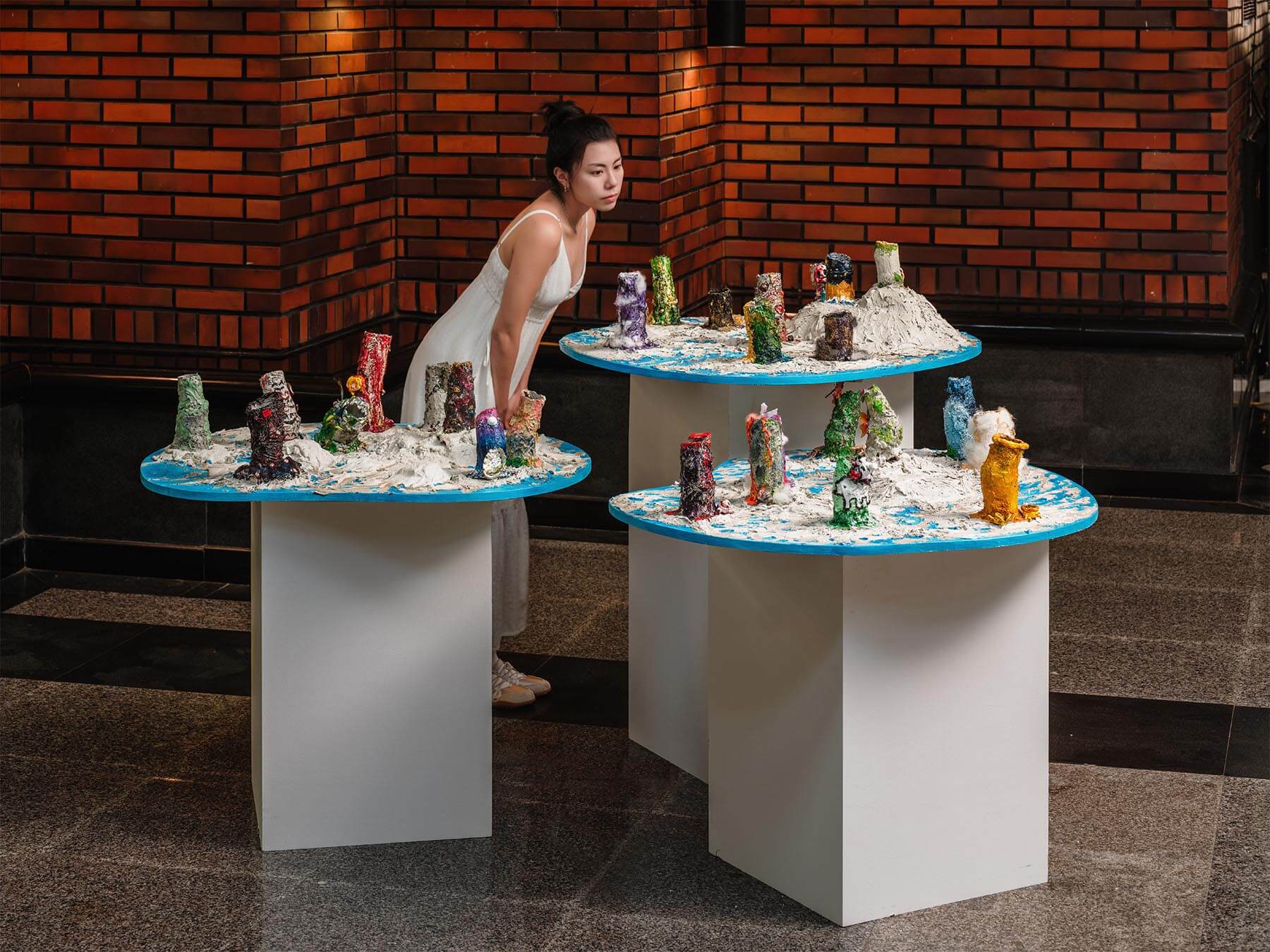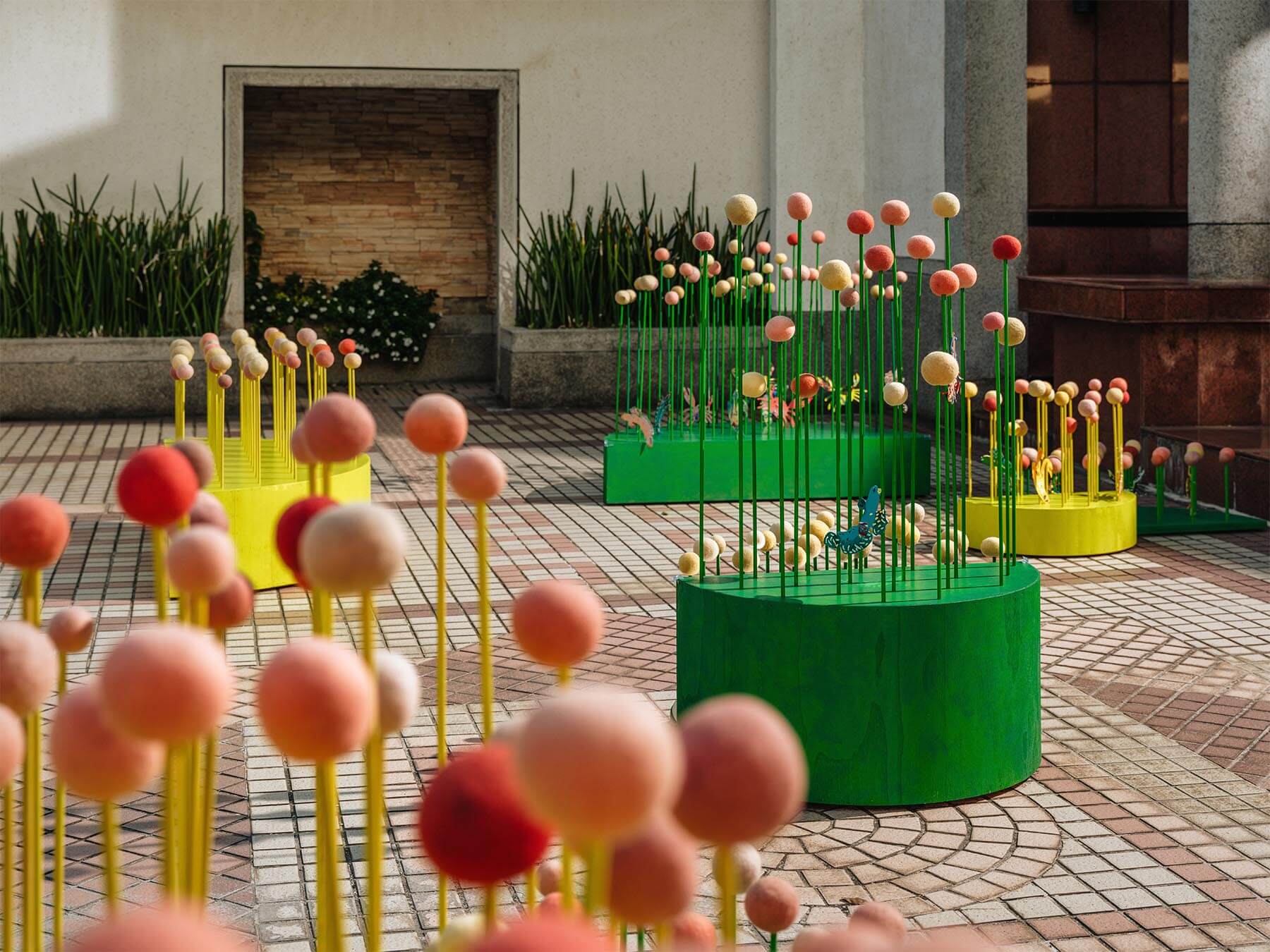 靈感來自濕地裡冒出的氣泡,她將一顆顆圓球高低錯落排列,邀請觀眾走進其中。在社區共創過程中,居民與孩子們以刺繡、穿線的方式參與,將濕地生物的圖樣縫入羊毛球中。當陽光落下、風掠過纖維,那片早已禁止踏入的濕地,彷彿又在城市裡重新呼吸。