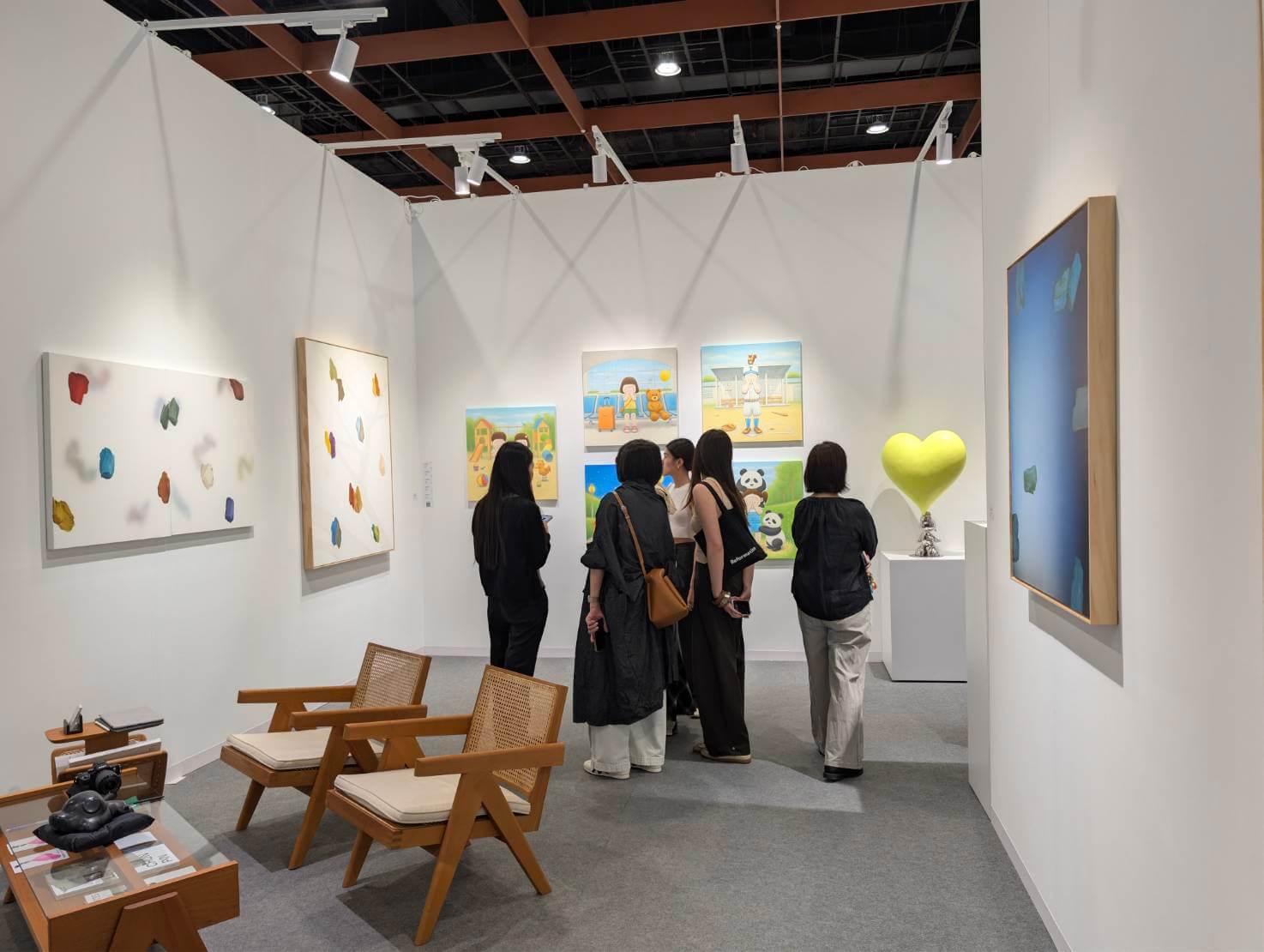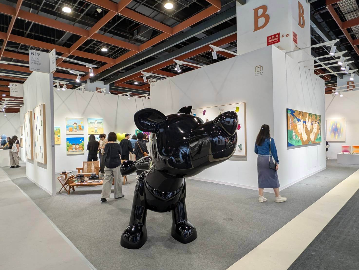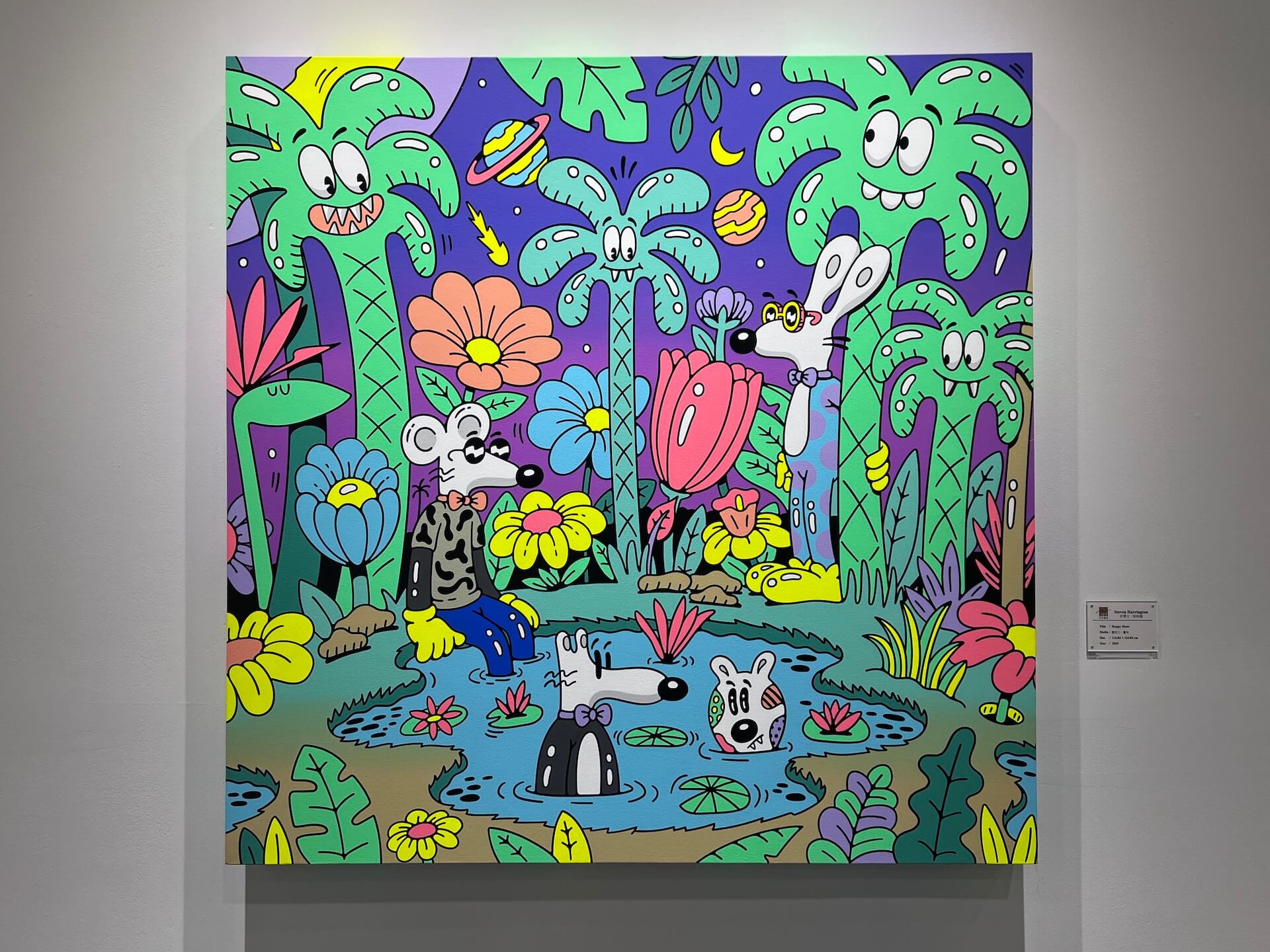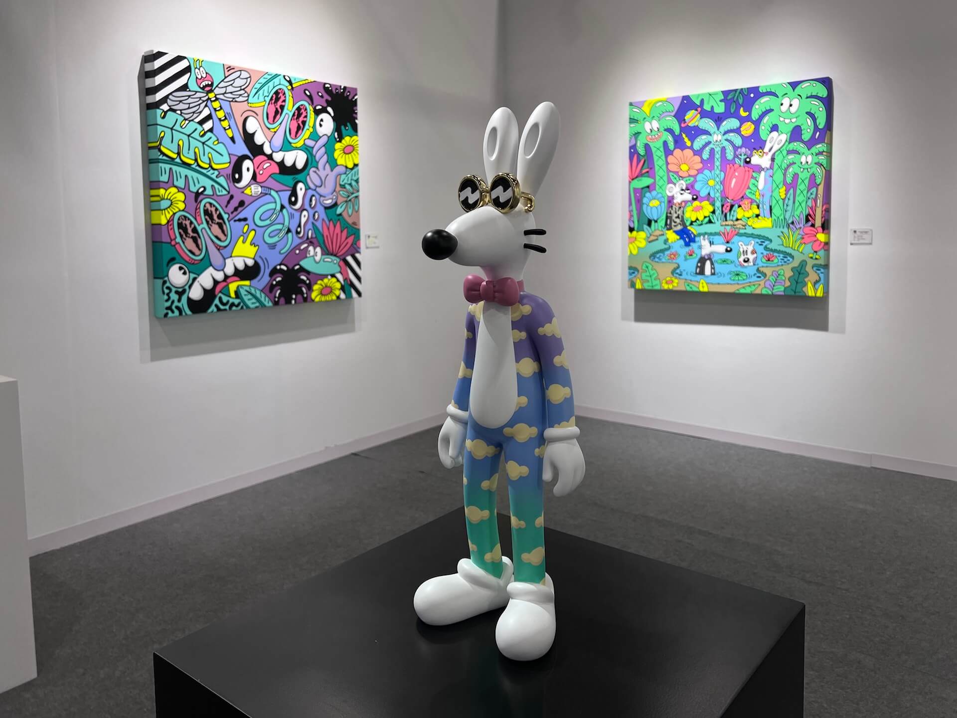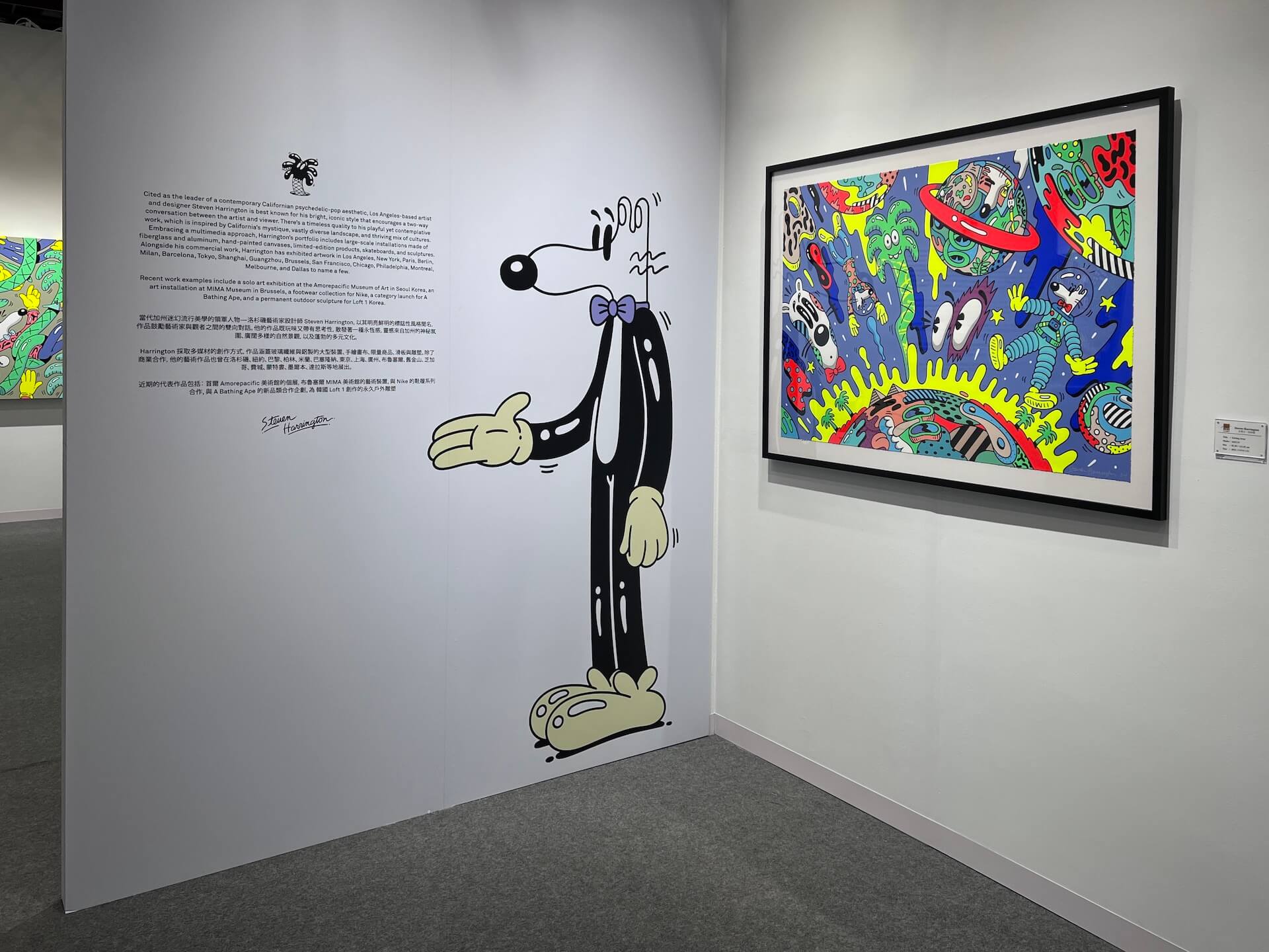 名典畫廊展位充滿繽紛色彩,散發派對一般的輕快氛圍,讓走過的觀眾都被感染。他們長期經營歐美潮流藝術,本次帶來紅遍國際的美國洛杉磯藝術家史蒂文・哈林頓(Steven Harrington, 1979-)的繪畫,以及難得一見的銅雕塑作品。畫廊表示,VIP 預展便有哈林頓的粉絲慕名而來,直接下了訂單,藝術家的魅力可見一斑。哈林頓身兼藝術家、設計師兼企業家,樂於在藝術創作與商業設計之間自由穿梭,認為兩者並無明確界線。他的圖像語言鮮明、辨識度高,深受品牌青睞:他為 Nike 設計限量球鞋,並與 BAPE、Converse、Uniqlo 等國際品牌合作推出聯名商品。