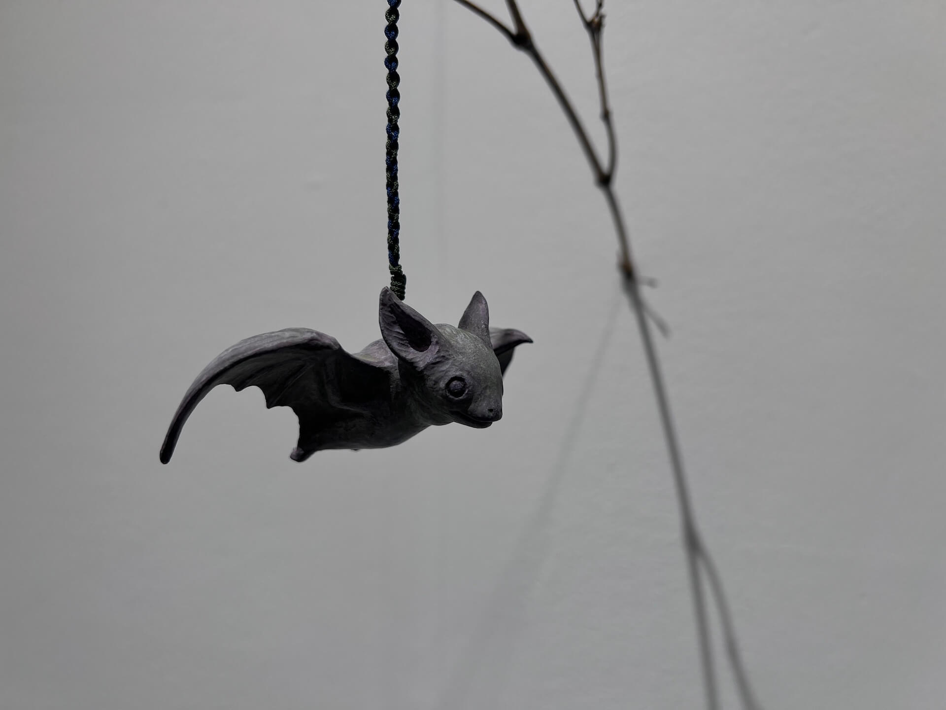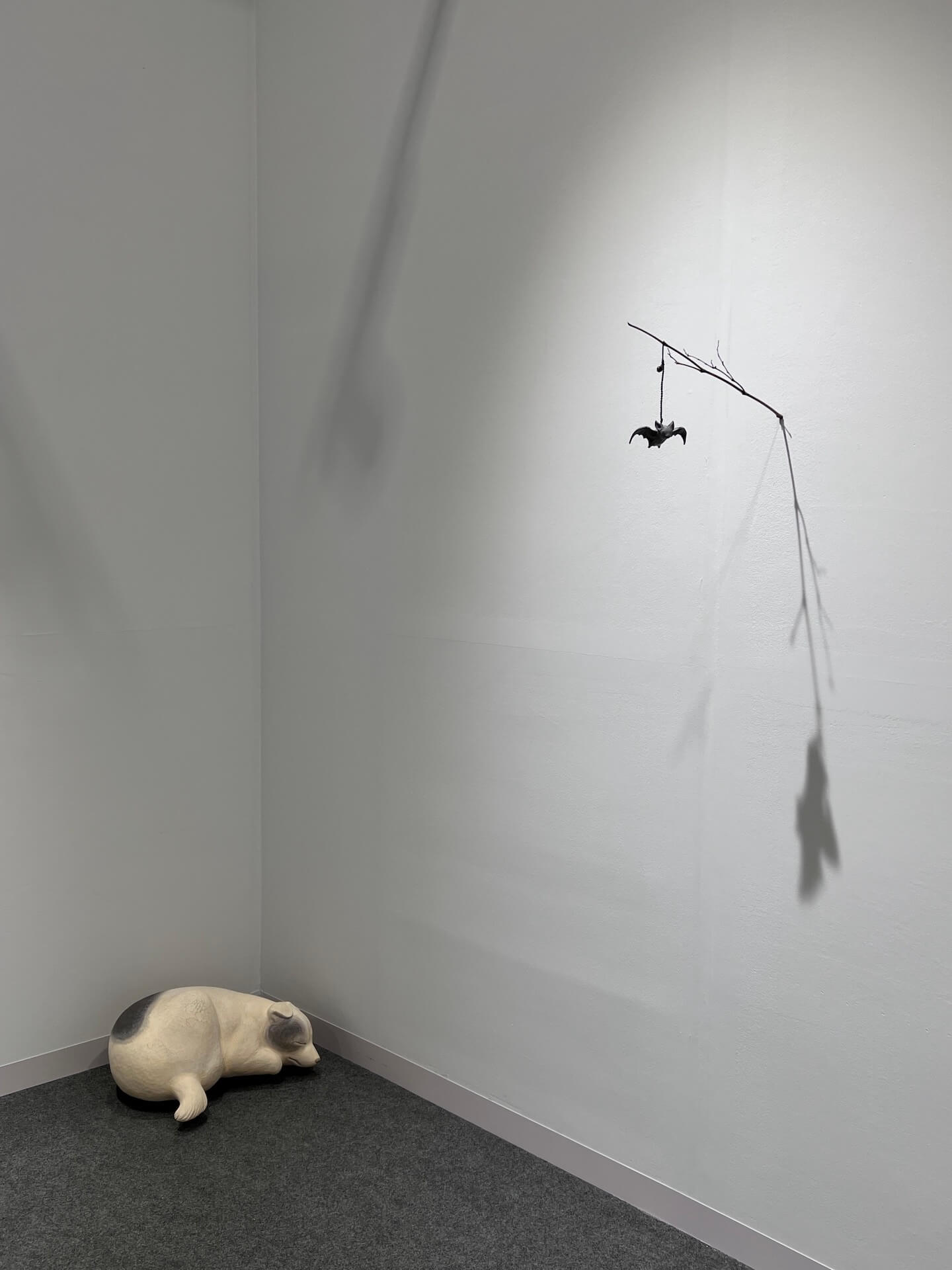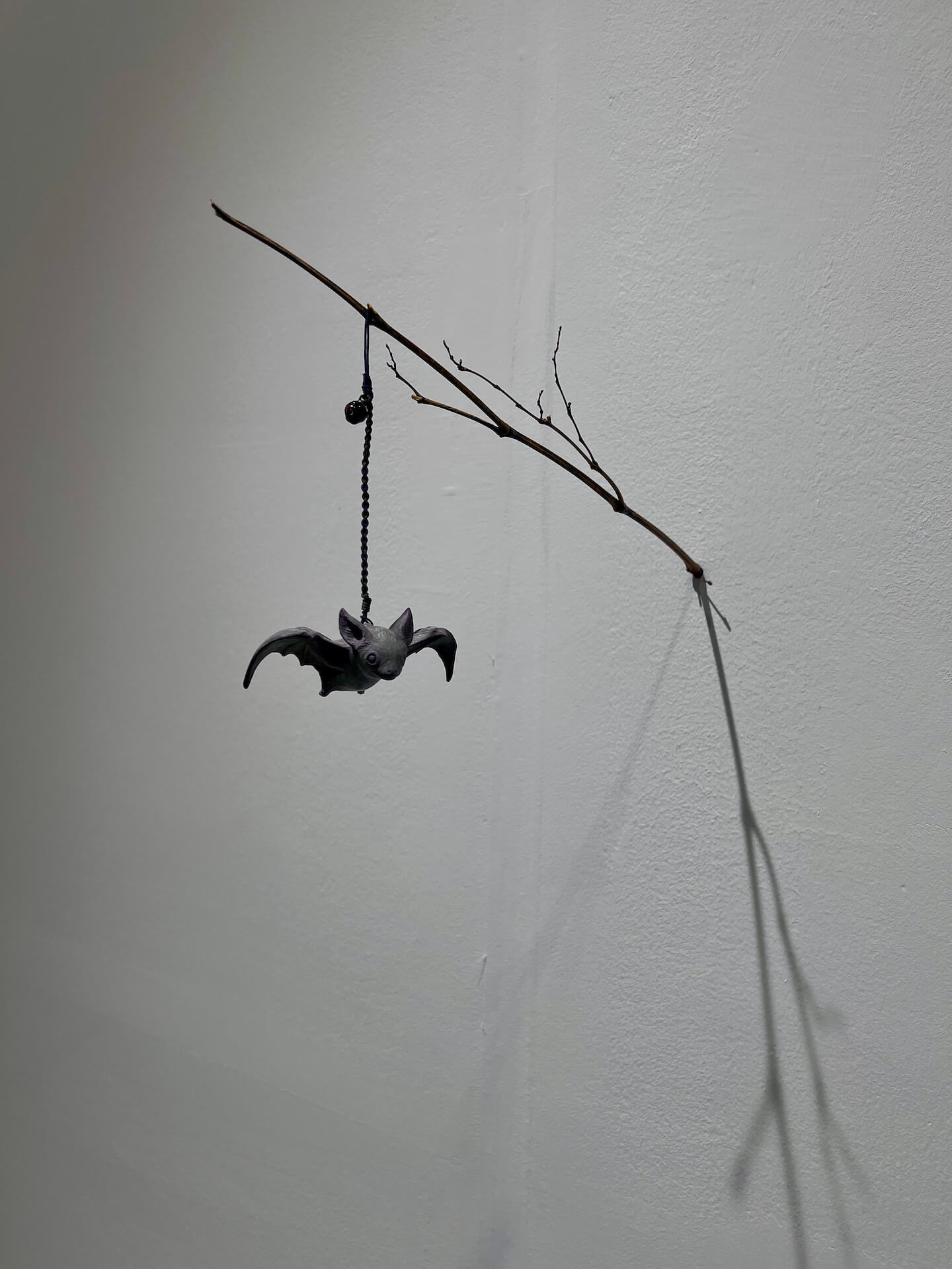 〈蝙蝠-新撰東錦繪 於富與三郎話〉(2025)以懸掛的蝙蝠作為主體,結合枯枝,形成一種寓言式的靜物。蝙蝠的姿態既輕盈又孤獨,懸於半空,作品延續平良光子對生命輪廓的細微捕捉,在極簡的構成中,使觀者感受到一種隱性的溫度與悲憫。