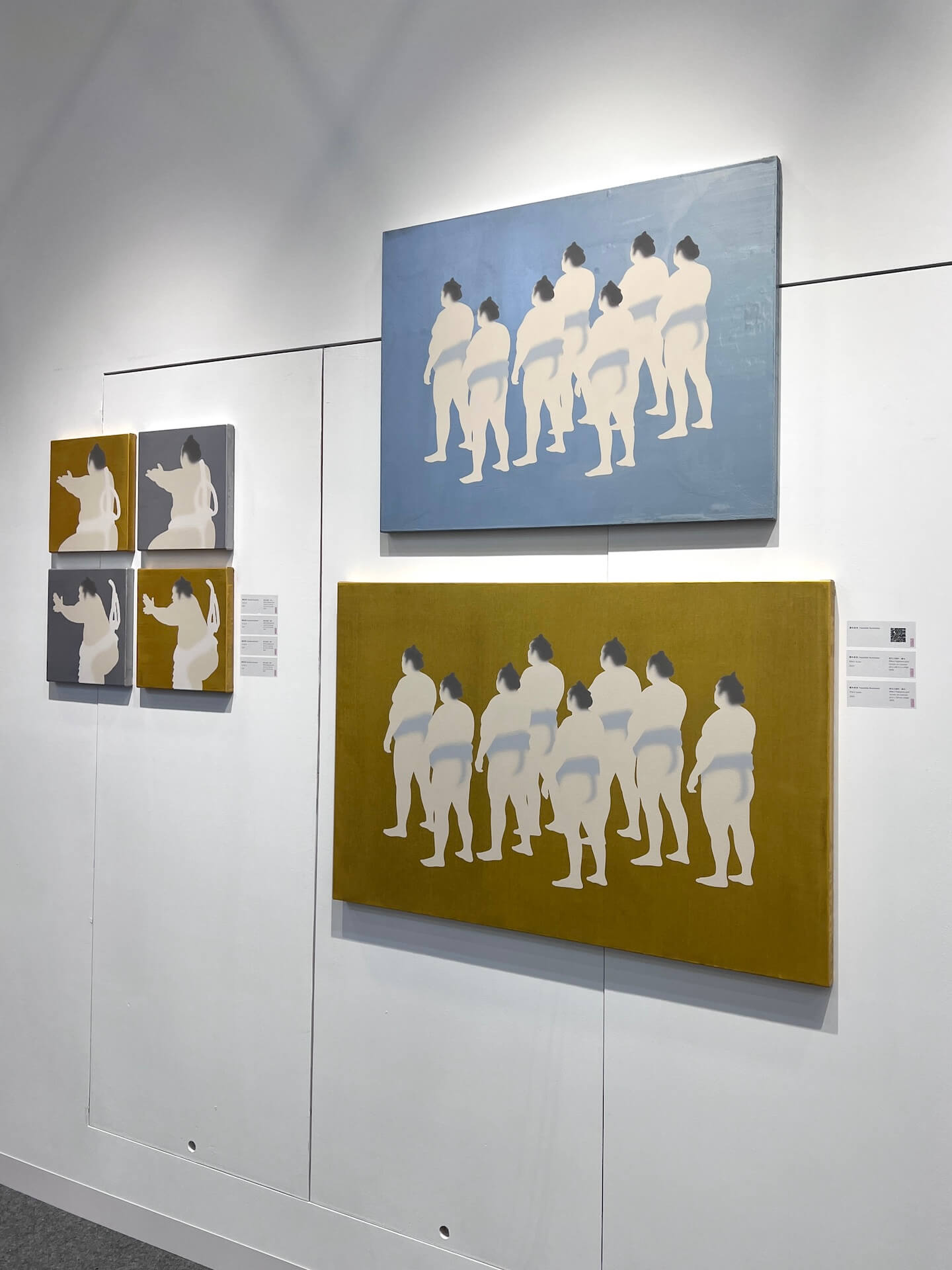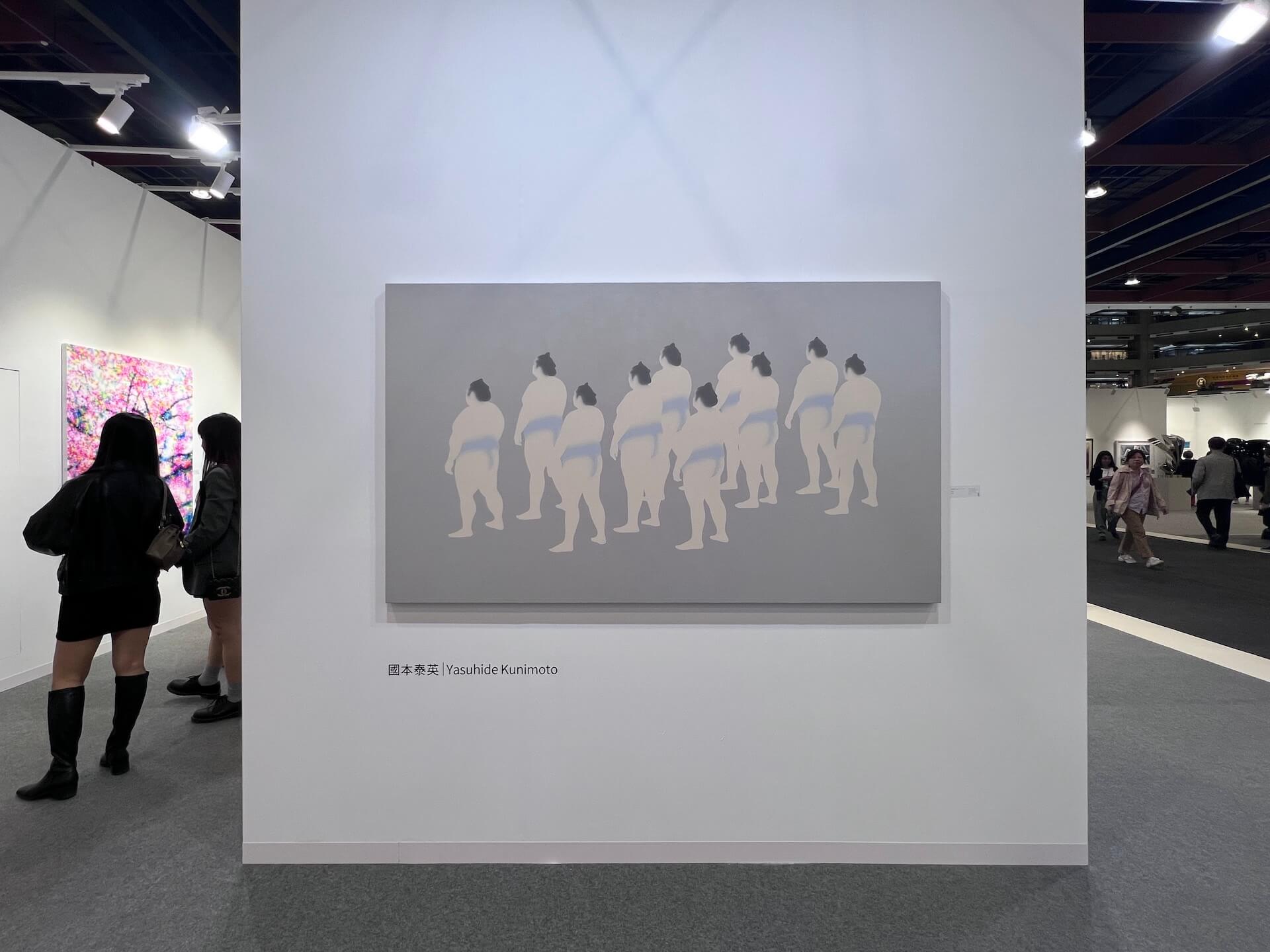 香港的觀止堂展位有一些小小的相撲力士,圓潤的形象乍看非常可愛,但仔細看這些去除臉部,稍縱即逝的輪廓,似乎又能讀到一絲絲不安。這是日本藝術家國本泰英(Yasuhide Kunimoto, 1984-)的作品,他以繪畫探問記憶與感知的關係,筆下的人物總介於清晰與模糊之間。畫面中常見的人物集體,如相撲力士、泳者或行人,皆以柔化的輪廓呈現,五官消失,僅留下體態的剪影,象徵記憶的不確定與個體在群體中的消融。這種對圖像的削減,使他的作品帶有觀念性,也隱含對當代日本社會匿名狀態的觀照。