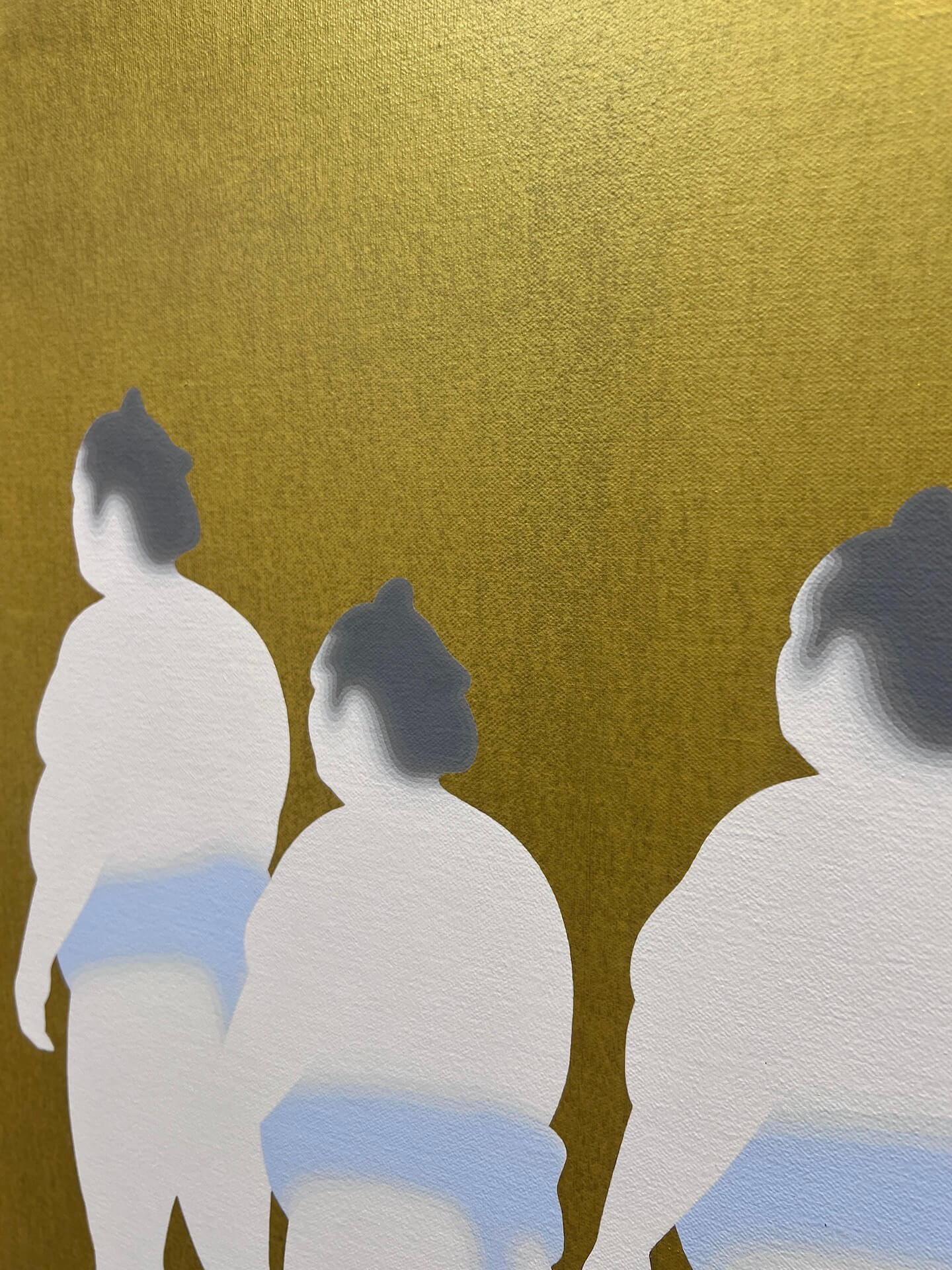 在〈Sumo〉系列(2025)中,他以壓克力顏料在畫布上描繪重複排列的力士形象,金、銀兩種背景呈現出靜謐而充滿儀式感的氛圍。人物被簡化為近乎膚色的色塊,僅以暈染暗示細微的光影變化。國本以極度節制的筆觸,讓相撲這一象徵秩序與傳統的主題,轉化為對「存在的模糊」與「記憶的集體化」的冥想。畫中人群既如儀式中的信徒,也像逐漸消散的影子,靜靜映照文化與個體在當代的距離。