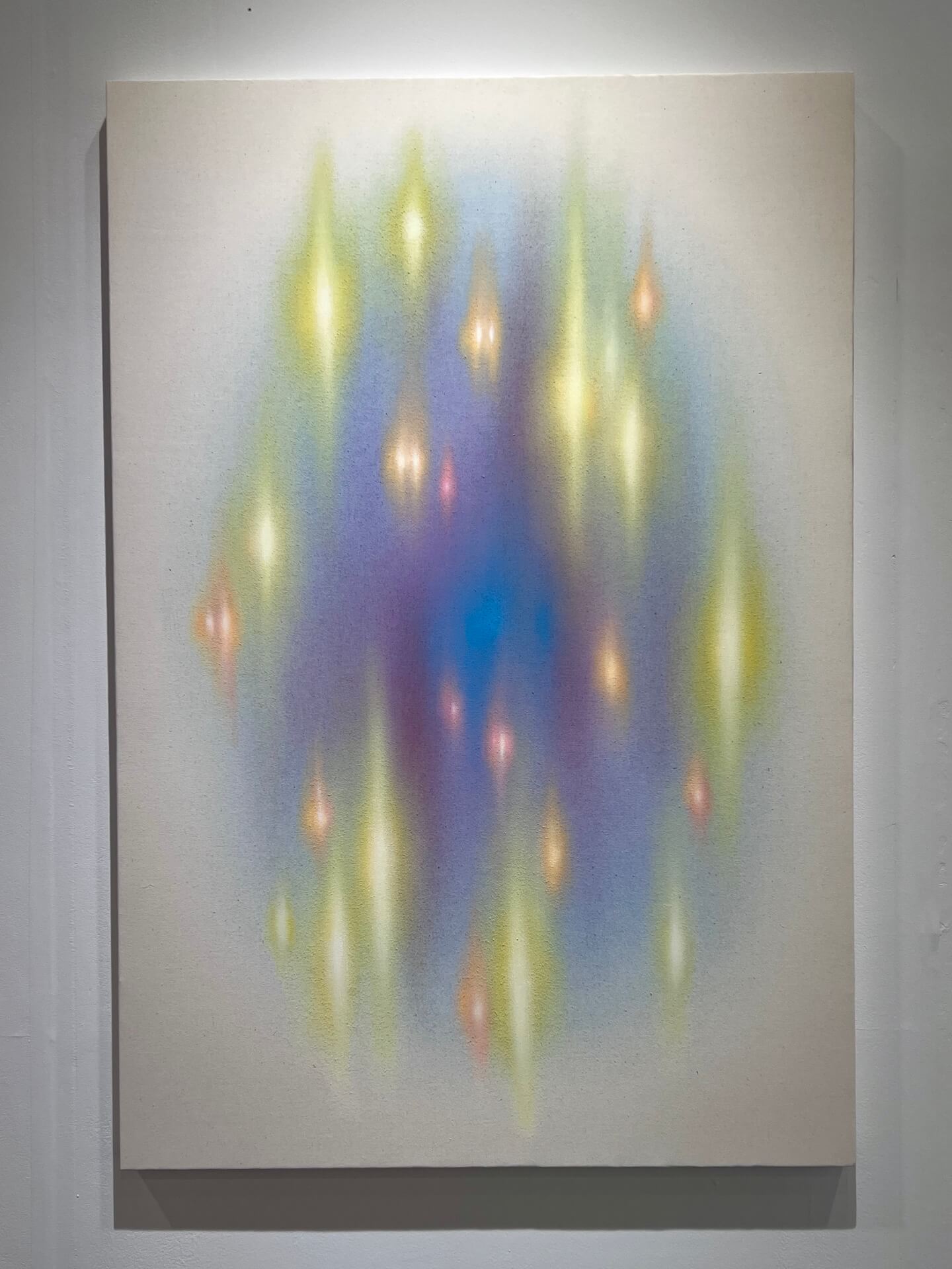 〈Ray of Light N.3 (Lilac)〉(2025)以紫藍為中心色域,外圍逐層暈散出金綠與橙黃的光暈,像是能量脈動在畫布中擴散。這些柔和的光點雖然沒有具體形體,卻暗示著生物、宇宙或靈魂的閃動,形成一種懸浮的視覺狀態。畫面中的亮光並非照亮物體的光,而是一種由內而外、指向心靈的光,帶有冥想與療癒的氣息。