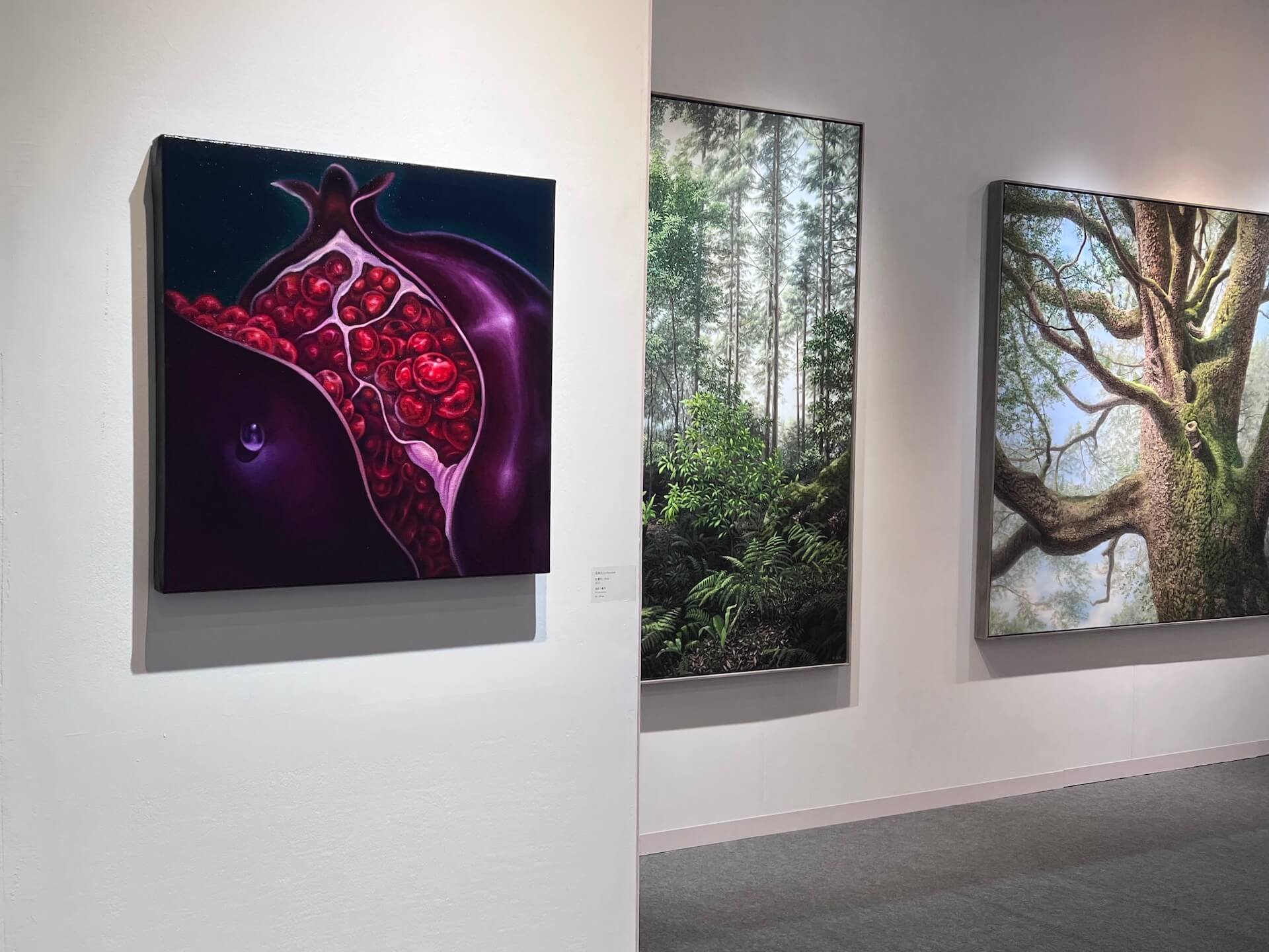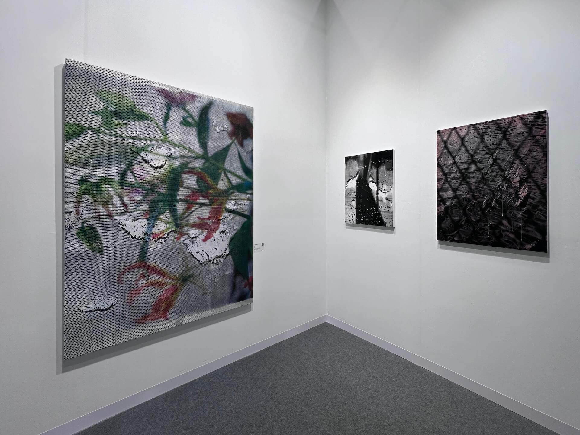 臺北的赤粒藝術在這次臺北藝博策劃了展覽「春光之外——凝視風景,看見時間的碎片」,精選七位國內外藝術家作品,聚焦於日常風景的觀看。其中,呂浩元(1981-)的〈紅寶石〉(2025)尺幅雖然不大,但畫面中神秘、詭譎的色彩和光影,在赤粒藝術的展位當中像是一個小小的異次元入口。呂浩元的繪畫以超近距離特寫的視角,將平凡物件轉化極具驚奇感的視覺經驗。