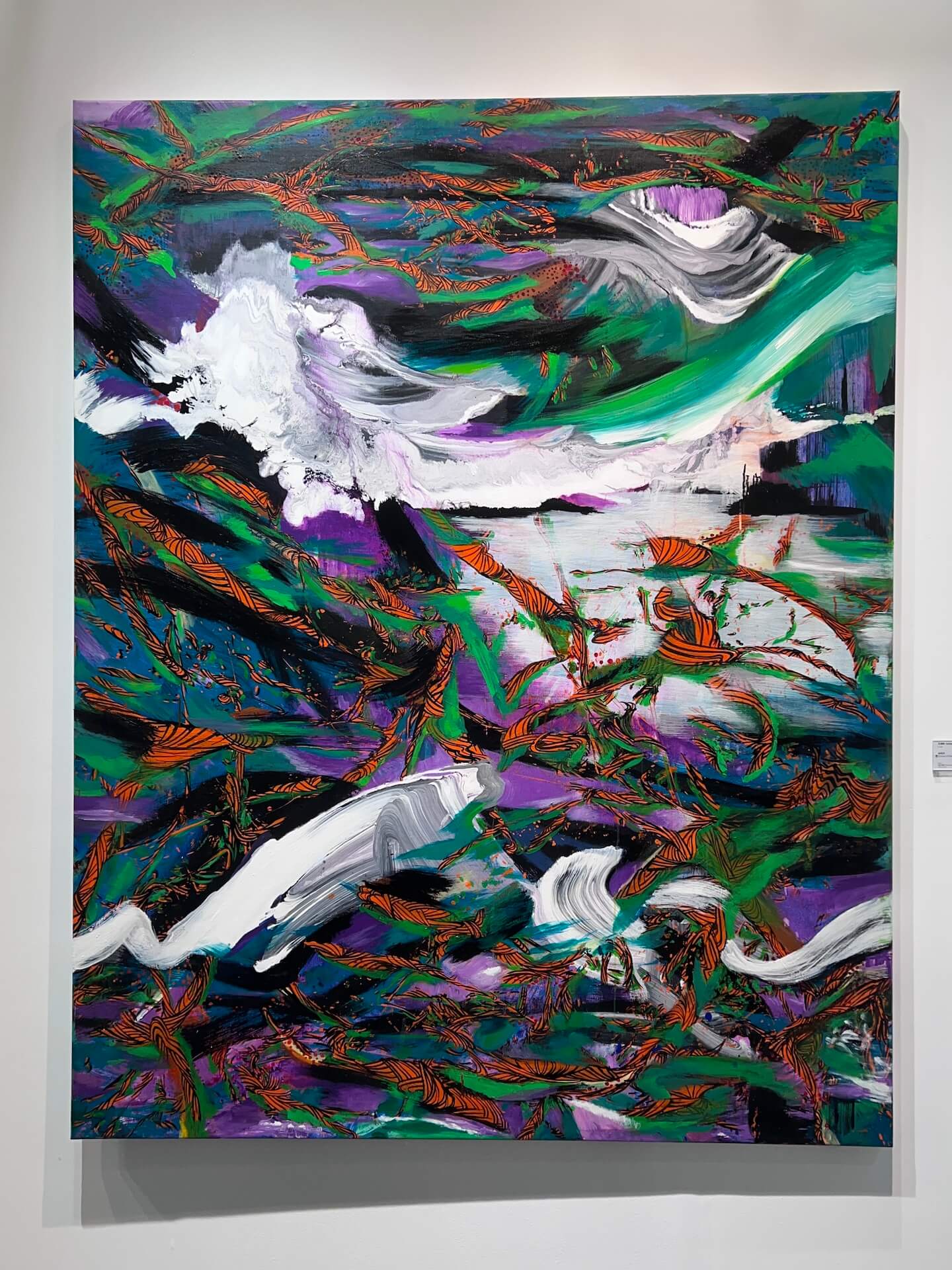 〈蜂鳴序〉透過顏料的反覆推移與堆疊,構築出介於抽象與具象之間的「複空間」,將多重、碎片化的感知、記憶與能量凝聚於同一時空體中。畫面色層對比強烈,紫、綠、白的筆觸翻湧交錯,如風掠過山林,而橙紅的紋路則似蜂群振翅穿梭,形成有機的韻律。作品喚起觀者對時間與存在的重新感知,使繪畫成為連結個人與世界的精神地景,也暗示著一種在動與靜、混沌與秩序之間不斷生長的力量。