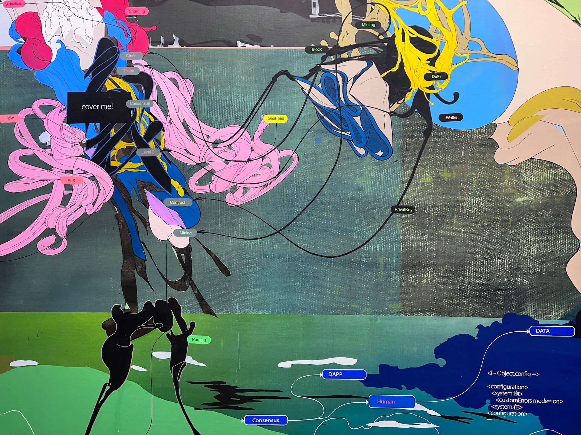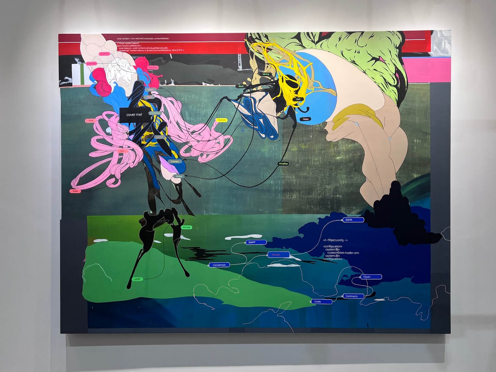 〈雙人隔岸相望圖〉(2024)延續他對人工智慧與人類意識的探問。畫面中兩個彼此牽連卻分隔的模糊形體,由程式語言、電腦介面、纏繞的線條與色塊構築而成,畫面同時具有生理與機械的脈動,散布的詞語如「DATA」、「Chain」、「Contacts」等,指向資訊系統內部的語法,作品以詩意而冷冽的方式描繪一種跨越不可能的凝視,人與機械在互為鏡像的網絡中相望,既靠近又疏遠。