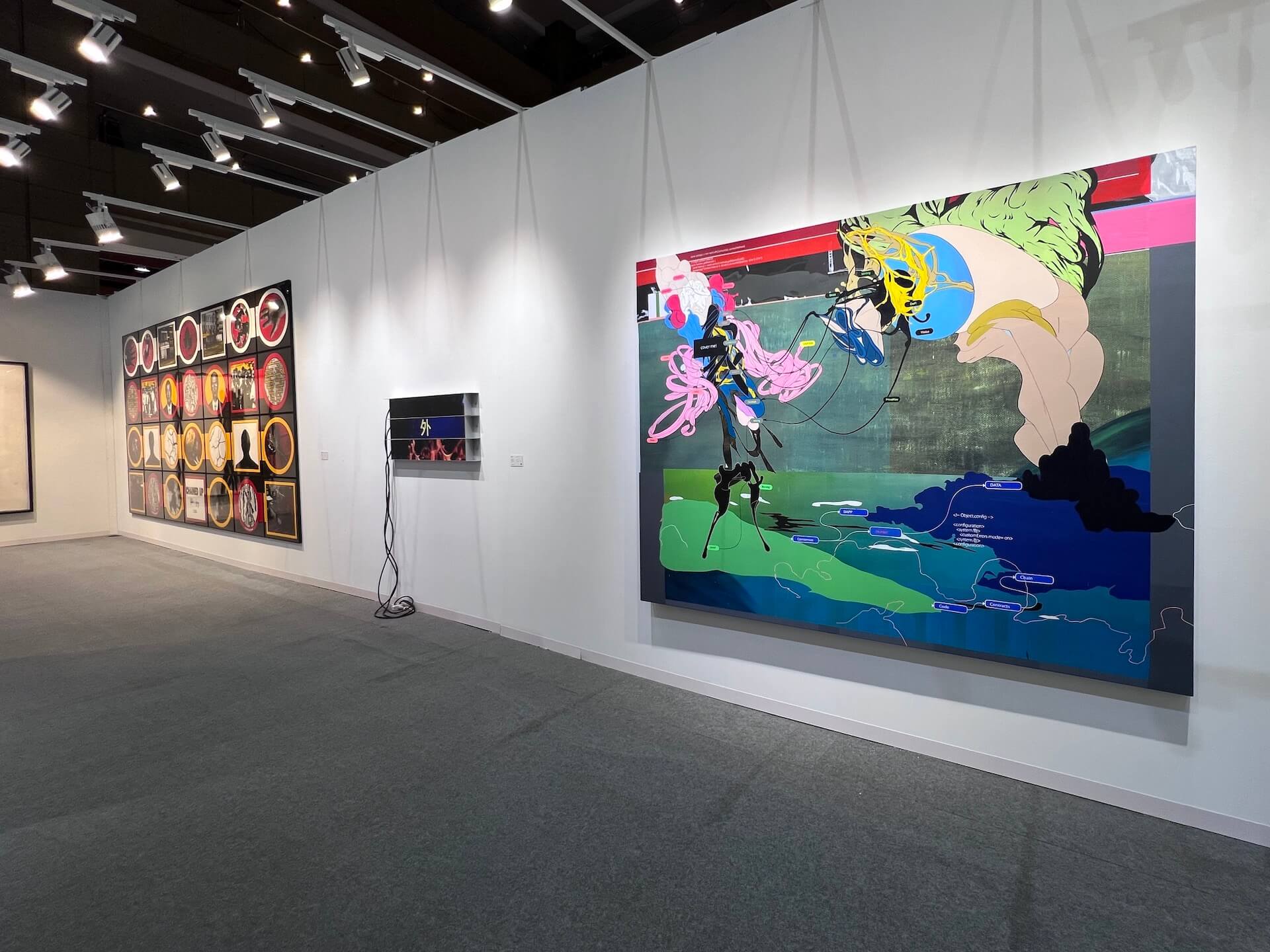 德薩畫廊(DE SARTHE)一向是臺北藝博會中最值得關注的焦點之一。今年,他們帶來中國北京藝術家鍾慰(1987-)的一幅 195 × 253 公分巨幅繪畫,以一種很酷、具未來感的 cyberpunk 視覺風格,強烈吸引了現場觀眾的目光。鍾慰的創作以數位文化為出發點,長期關注人與科技的權力關係轉移。他從網路蒐集大量圖像、符號與迷因,然後重新編碼這些碎片化資訊,使其轉化為有機的視覺實體。藝術家將圖像和意義的偶然性組合成新的語境,反映當代社會在演算法驅動下的感知變化。既是網路考古的結果,也是科技時代的情感產物。