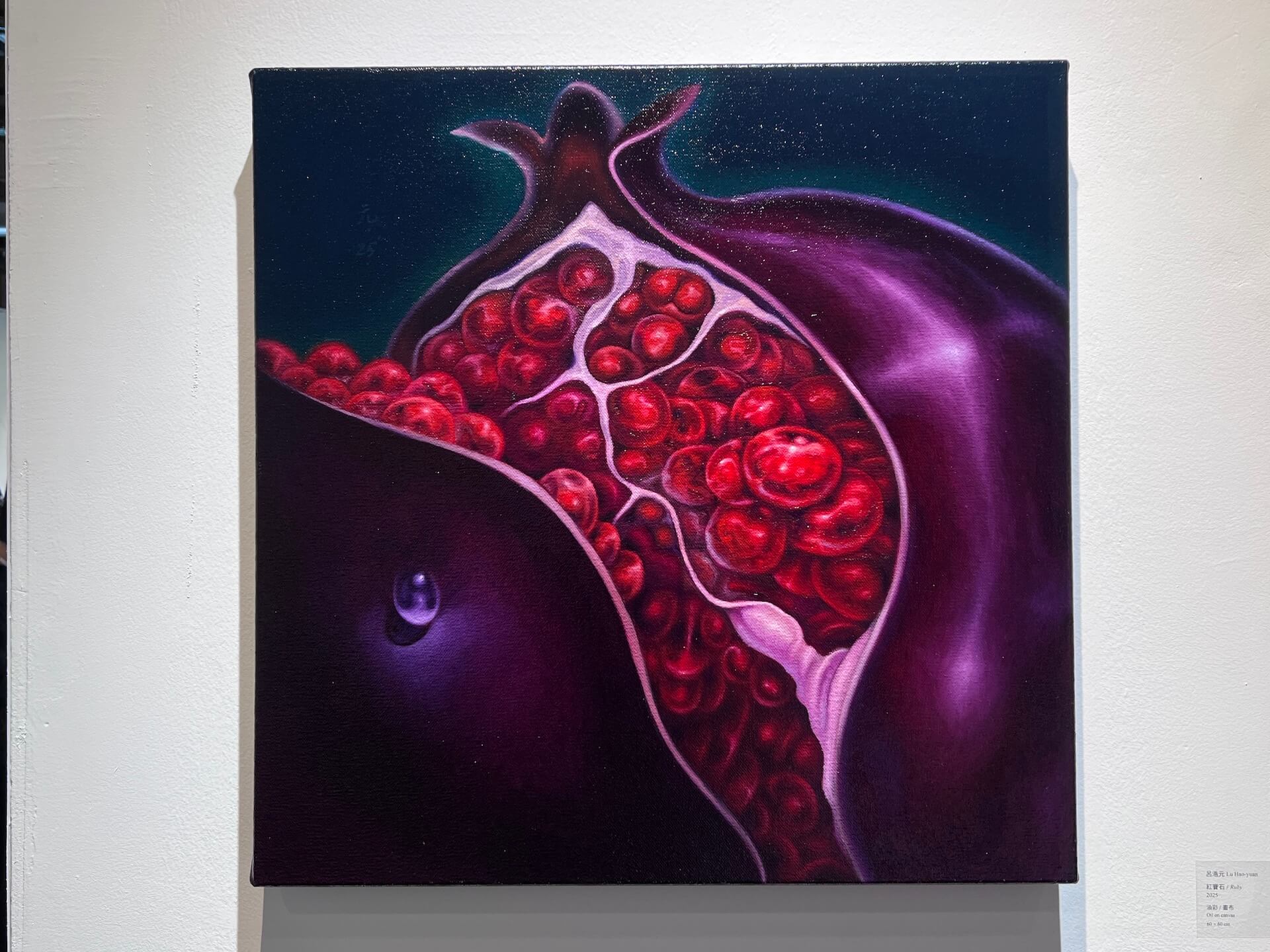 〈紅寶石〉以石榴為象徵性主體,果實被切開後露出的鮮紅果粒,與暗紫色外殼如肌膚般貼合,形成擬人化的身體器官暗示。藝術家以寫實技法描繪,卻營造出超現實的氛圍;果肉光澤與濕潤質地在光線下閃爍,散發曖昧與危險的誘惑。這件作品延續呂浩元對情色與禁忌的探問,回應了巴代伊(Georges Bataille)所言:「情色是通往內在經驗的門」。藝術家透過繪畫在靜物中捕捉生命與慾望最細微的流動,靜物因而成為了聖潔與褻瀆共構的場域。