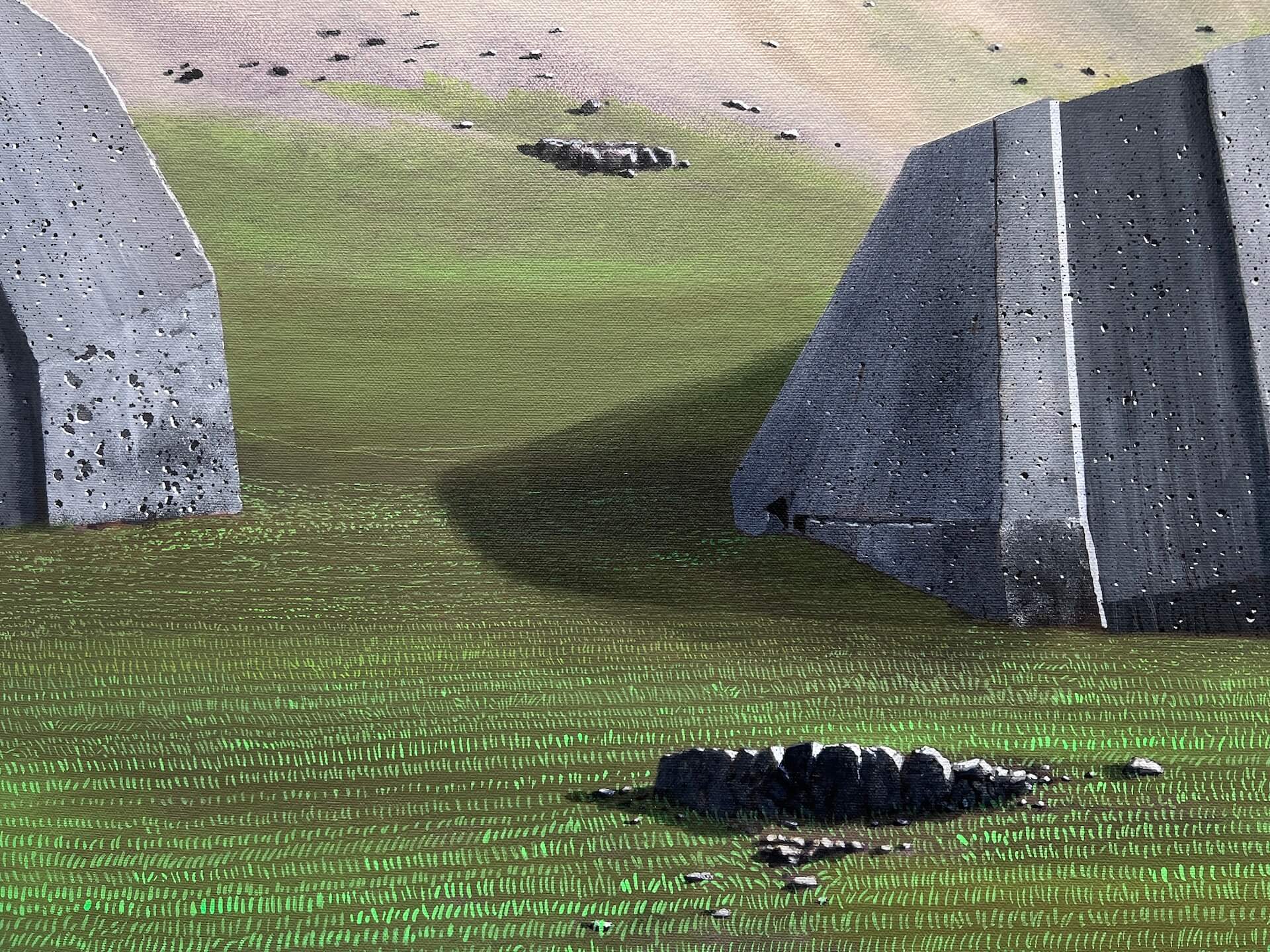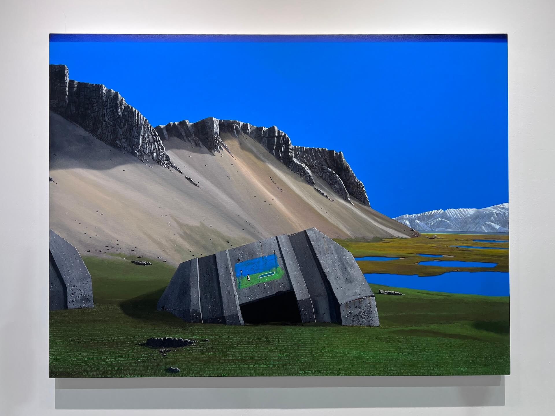 〈Into the Metronome〉(2025)青藍的天空與峭壁對照兩座水泥構造體,其間一塊嵌有企鵝和泳池圖像的混凝土板像是文明遺跡,矗立在荒原當中。這個場景像凍結的時間,觀者被引入一個既真實又幻象的時空。泳池的藍、山體的灰,以及如螢幕般超高飽和的天空彼此牽引,使風景介於自然與數位模擬之間。