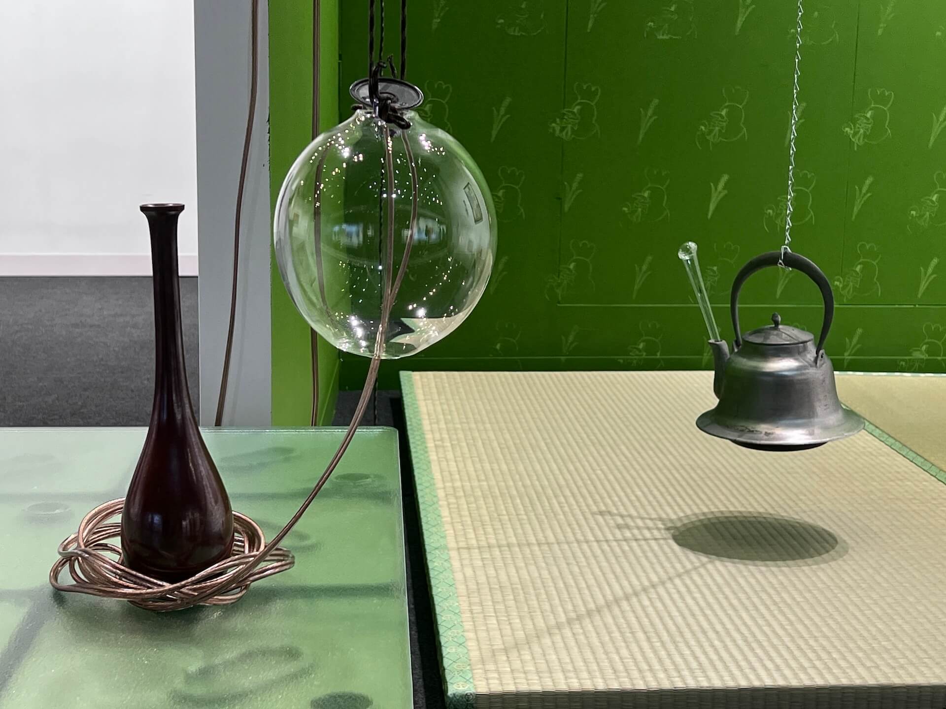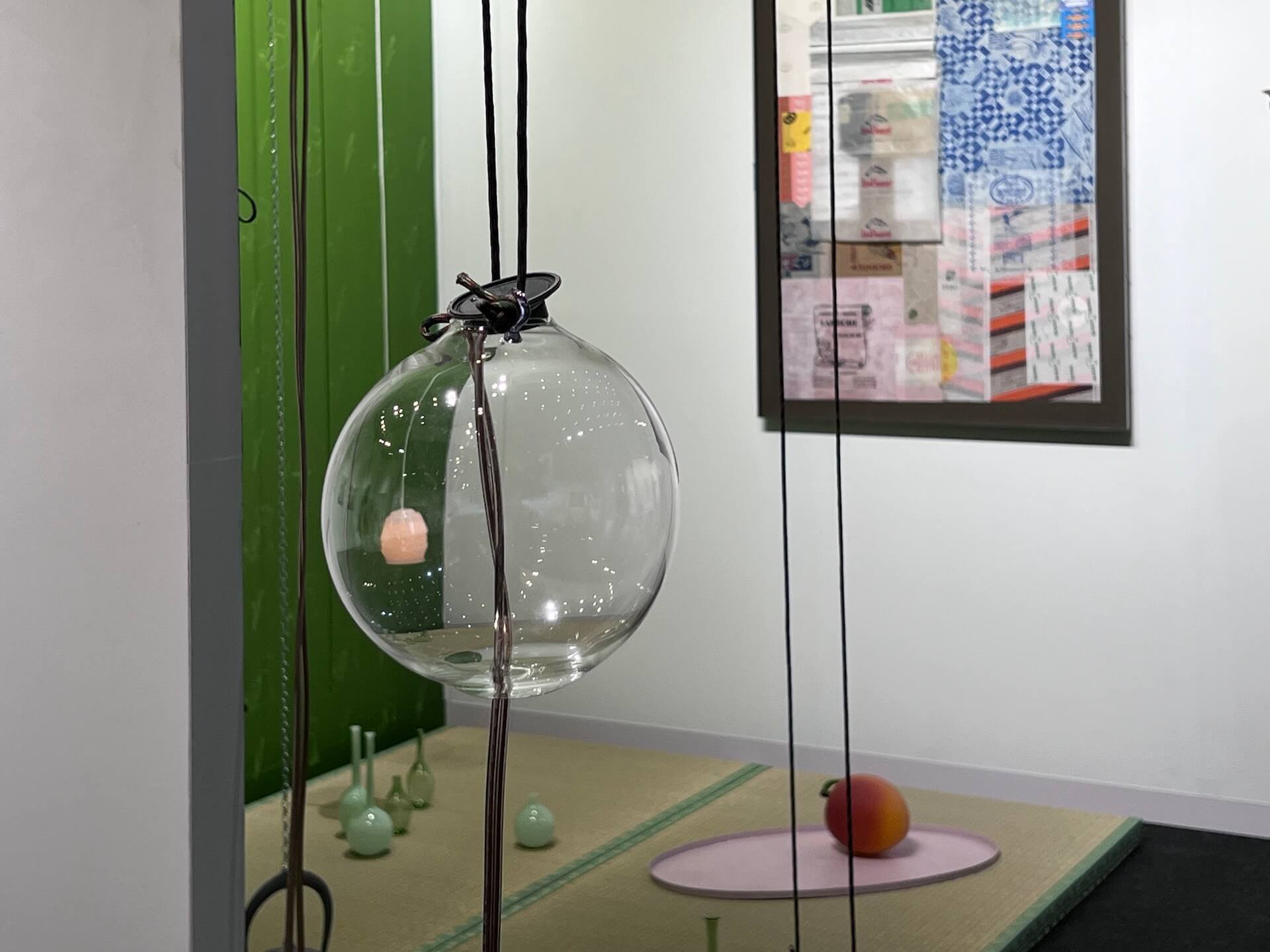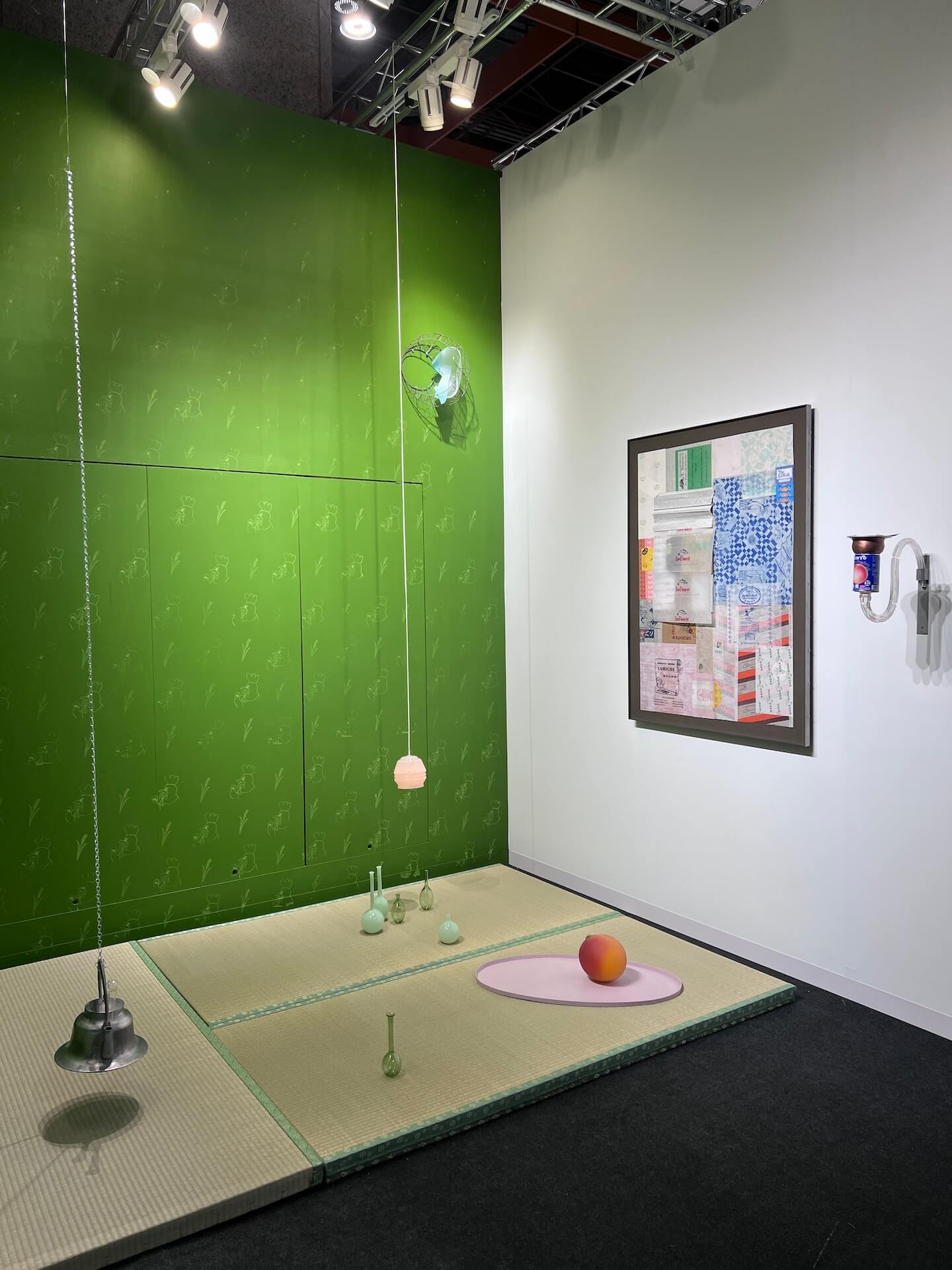 裝置中的水蜜桃雕塑、榻榻米、玻璃製品、銅管、鐵壺與燈泡,以懸吊、連接的方式,被置入一個靜謐的綠色空間,形成一個像是茶室,又像實驗室的場域。她將連鎖餐廳包裝紙層疊拼貼成繪畫,暗示著全球化商品的流動。水果罐的雕塑,在消費功能與藝術語境的張力中產生新的意義。藝術家使用這些具有矛盾性質的媒介,構築一個詩意的「微景觀」,讓觀者在熟悉物件中產生了具反身性的陌生感受。