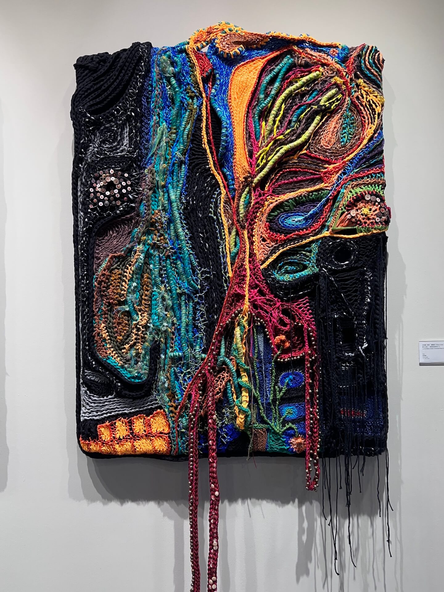 〈棲水之地:一個消逝的所在〉(2025)以纖維塑造層疊的有機形態,明暗色線交錯如河流與血脈,螺旋結構指向了一個母性身體的內在宇宙。紅橙與藍綠的纖維交織出呼吸般的節奏,垂墜的線條則像生命的遺緒,留下消逝與再生的伏筆。整件作品在柔軟的形體中蘊含堅韌的意志,正如土地在水的記憶裡復甦,也讓身體重新找到安放的所在。