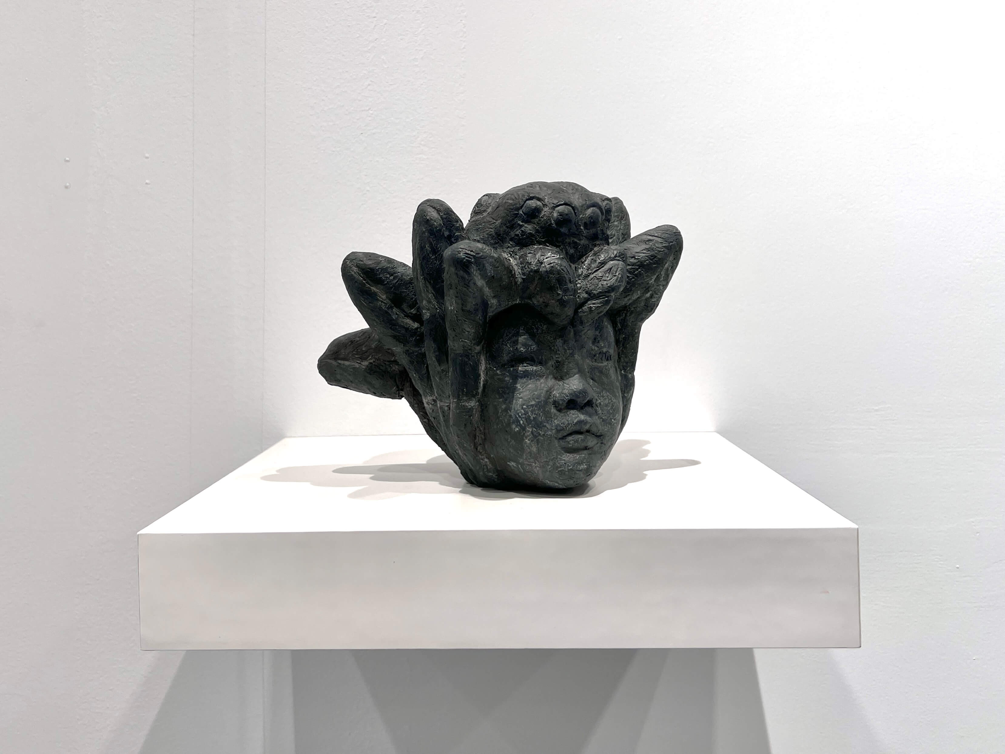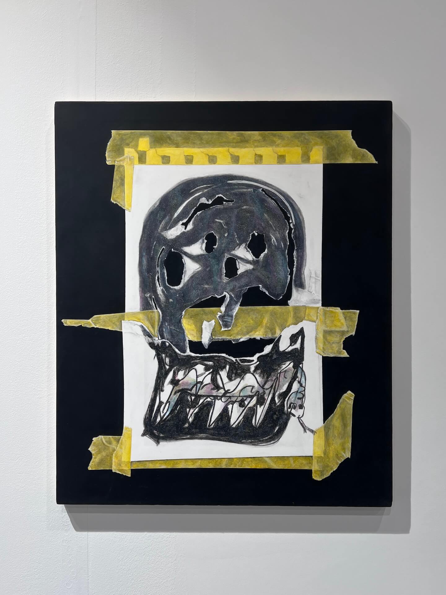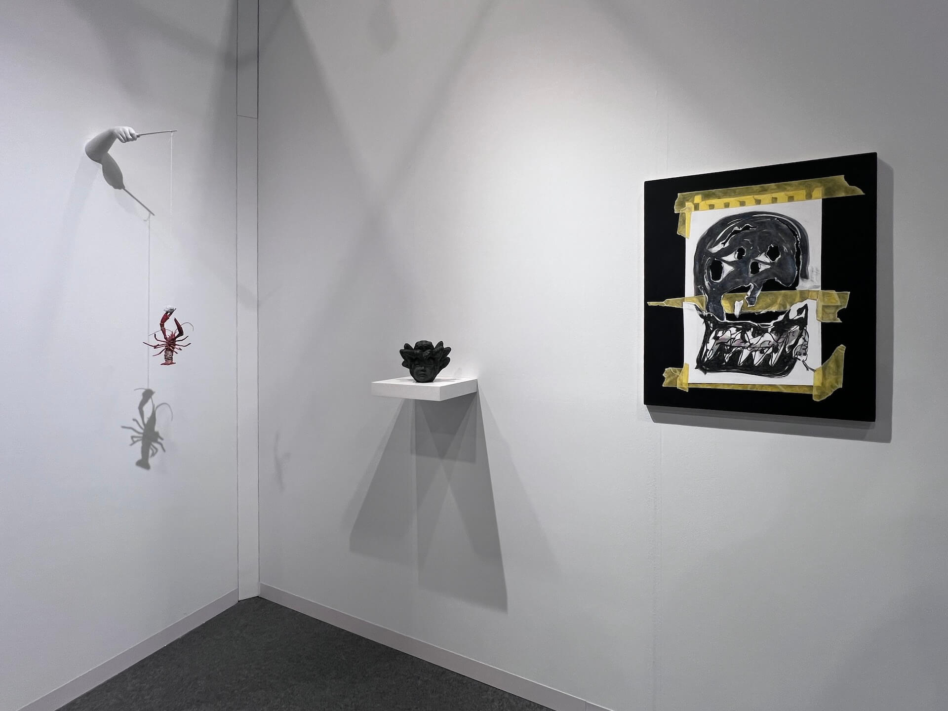 〈duplicity the ripper〉(2024)延續他對主體裂解的探問。畫面中央一張被黃色膠帶黏貼的素描紙,描繪著骷髏與獸齒錯置重疊的頭部結構,像是一張臉孔在撕裂過程顯露雙重內在。線條混濁、牙齒鋒利,將潛伏的自我攻擊與心理異化暴露於視覺層面。與之對應的裝置物件:懸吊手臂與紅色甲殼生物、黑色的頭像雕塑,使整體展場成為裂解現場,不再訴諸敘事,而是直面心理機制的操演。