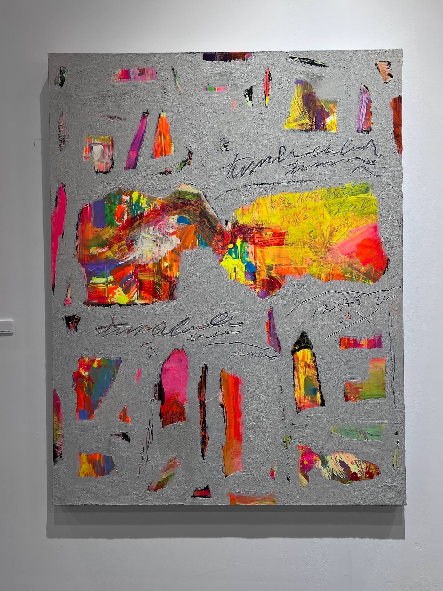 在〈The Trace〉(2025)中,灰色肌理帶著細微的顆粒表面,如牆面或地層,炙烈的霓虹橘、桃紅、檸黃等色塊鑿刻其中,揭示了時間斷層。畫面中可辨識的筆跡、斷裂的數字與近似筆記的手寫線條,使作品遊走在視覺、符號、語言與書寫之間。這不只是色彩的拼貼,而是對記憶、情感的編碼。