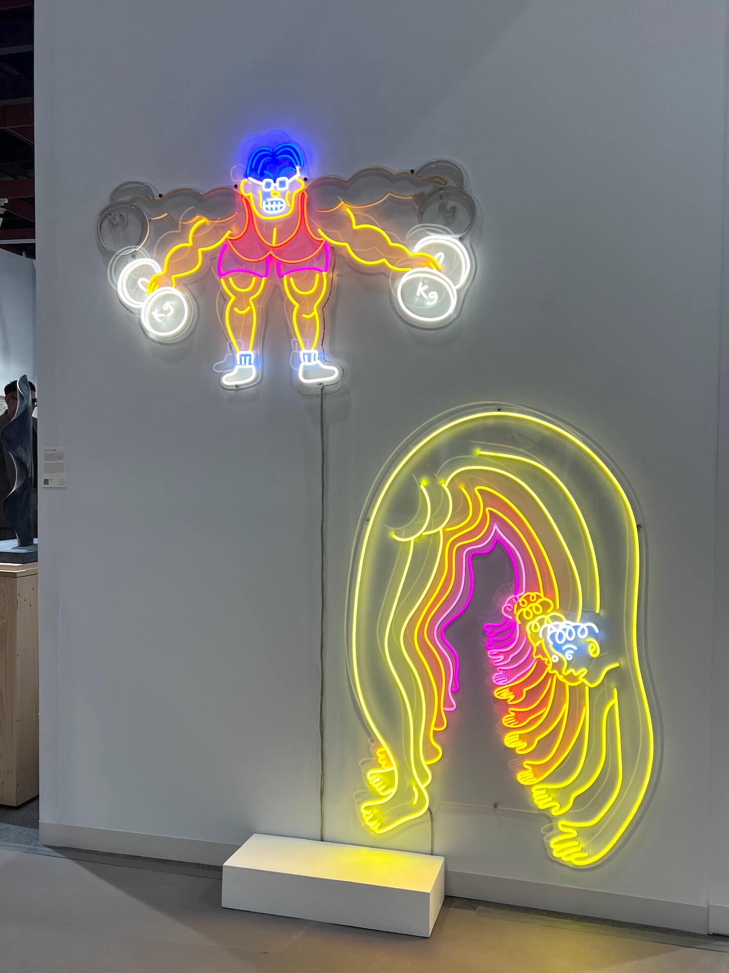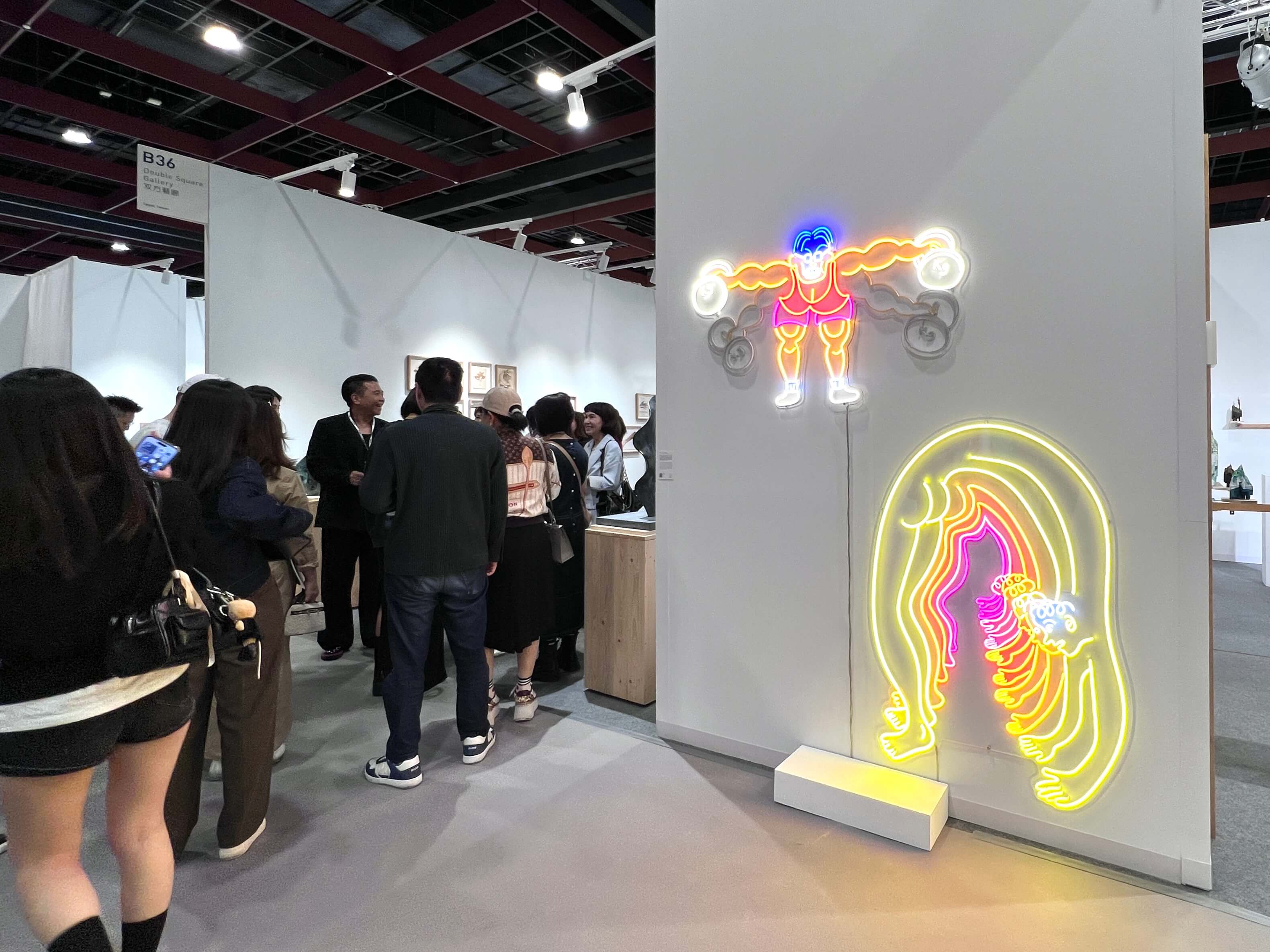 臺北的双方藝廊今年依然是全場的人氣王,展位的佈局盡是巧思,入口處一組黃海欣(1984-)的舉重人和瑜珈人霓虹燈裝置,既可愛又有趣,讓人無法忽視。臺灣藝術家黃海欣的創作聚焦在當代社會的日常荒誕,並以大眾媒體與公共影像為切入點,觀察個體在文明規訓下的各種滑稽姿態。無論是政府宣傳、社會新聞,或社群媒體中被不斷複製的日常表象,這些圖像往往被重組為一場介於現實與表演之間的戲劇。