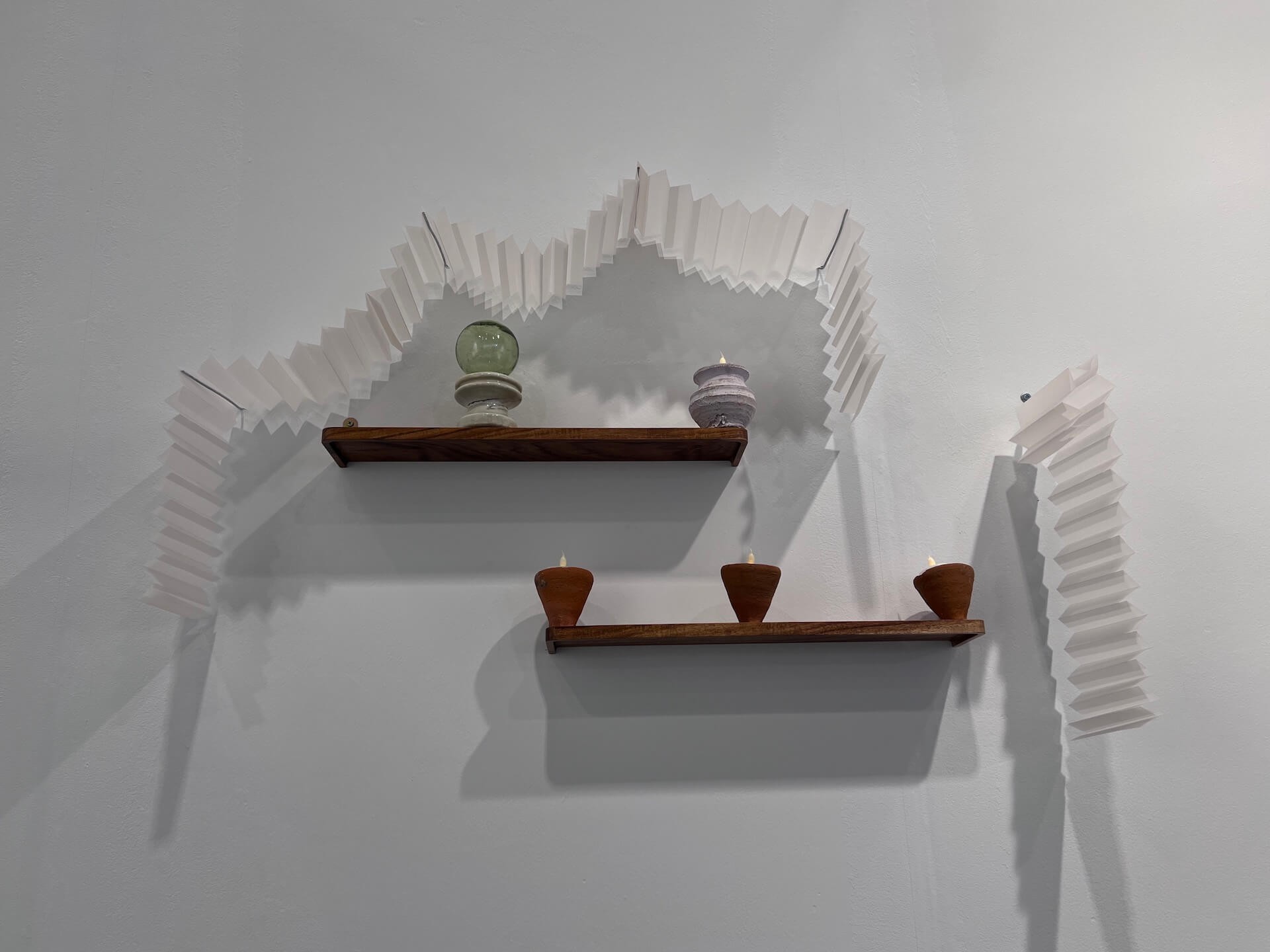 金澤水銀窟的牆面,以樹枝懸掛了一件非常細小卻精緻的小蝙蝠,這是日本藝術家平良光子(Mitsuko Taira, 1996-)的作品。她擅長用樟木雕刻動物形象,並以礦物顏料細膩上色,維持木質的溫潤與生命氣息。她的作品多取材自宗教的象徵,將生命的純粹與人性的脆弱結合,呈現一種靜謐而深沉的美學。