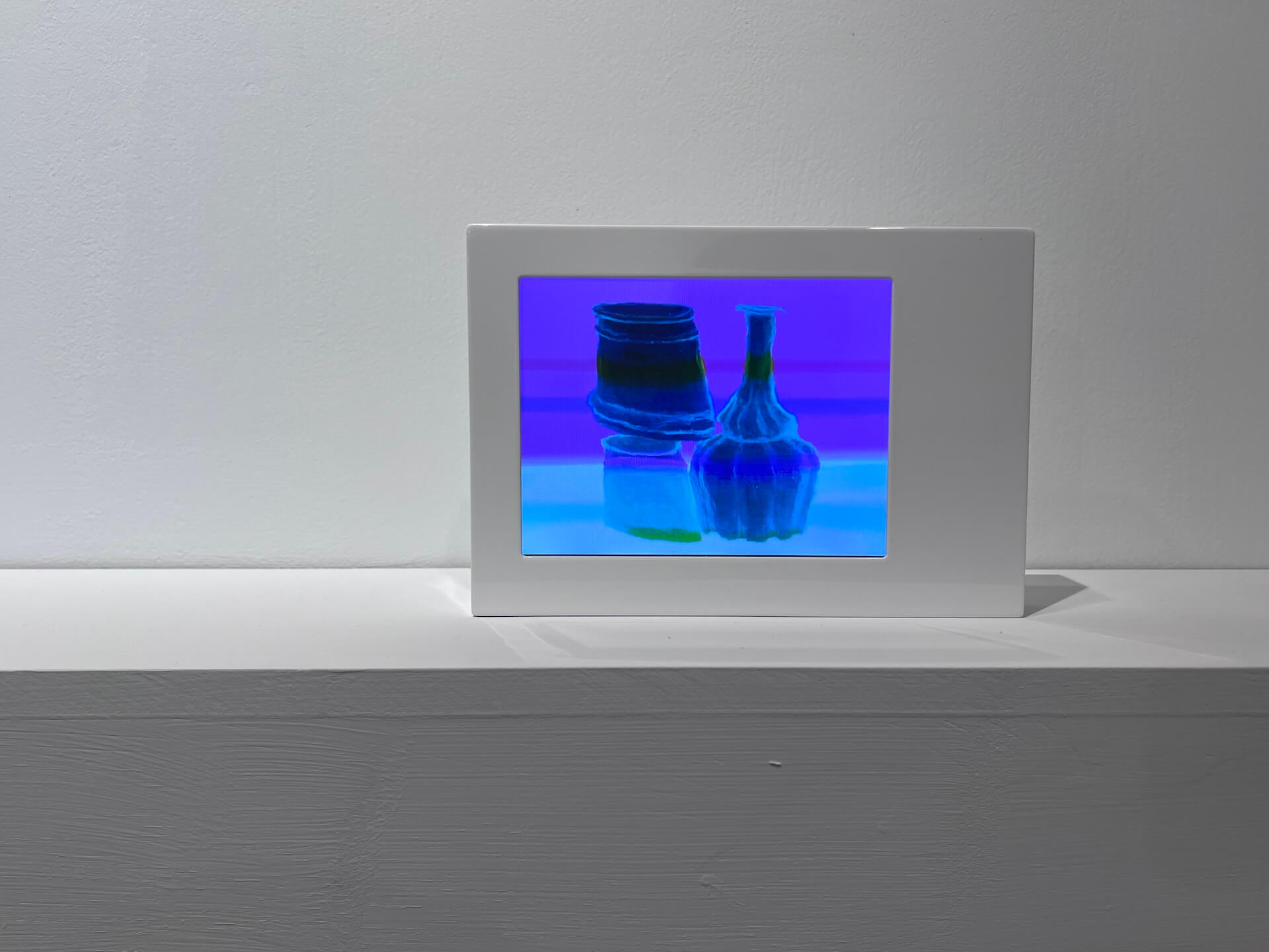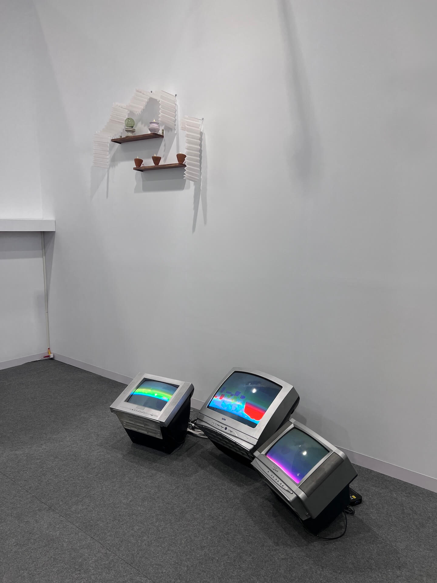 2025 臺北藝博「MIT 新人推薦特區」透過公開徵件的方式,選出了 8 位 40 歲以下的臺灣藝術家,走入這個展區,特別能感到一種清新的空氣。其中,吳尚洋(1992-)和臺北的東家畫廊合作,呈現〈隙像〉系列影像裝置。延續他對莫蘭迪(Giorgio Morandi)靜物繪畫的研究,將數位影像、映像管電視與電子相框並置,並納入他在印度駐村時拾得的陶製容器,融合他遊歷印度神廟的經驗,將這些拾得物搭建成一座神壇的形象。日常、無名的物件與螢幕中的色帶影像相互對照,構成一種「異地靜物」關係場域。