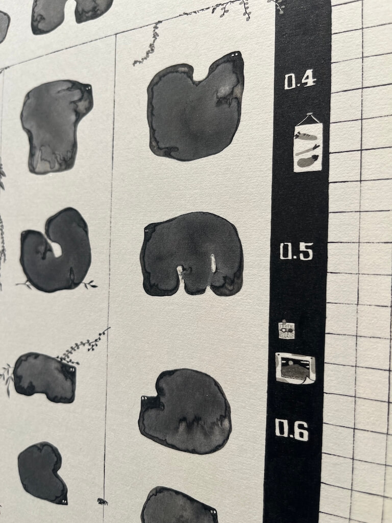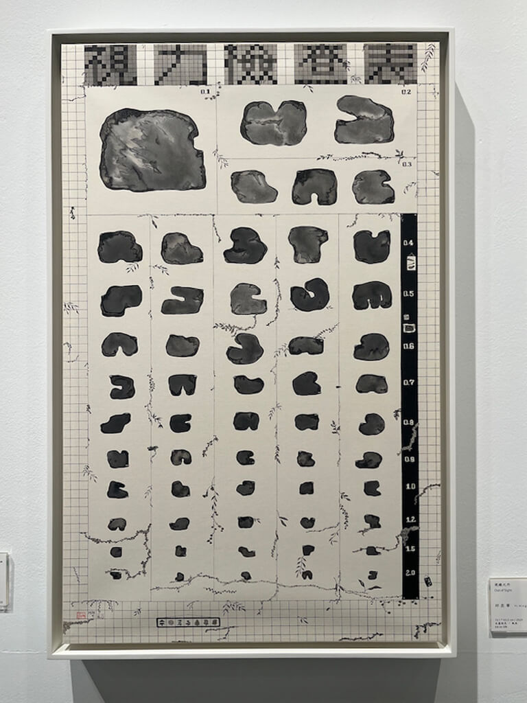 2025 年新作〈視線之外〉將石頭形體融合視力檢查表,構成兼具象徵與實驗性的畫面。仔細觀察,可見植物攀附其間,掛畫與紙條等日常小物被縮至極小,挑戰觀眾的觀看與互動。視力似乎象徵觀看的焦點,而「視線之外」指向那些容易被忽略的日常片刻。邱奕寧以畫筆打撈出這些被排除卻充滿生命溫度的事物,讓平凡之景在她的筆下重新被看見。