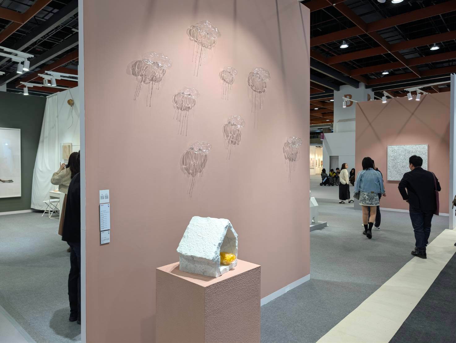 特別的是,這次展出將數件來自《靈動系列》、雲朵形象為靈感的作品,佈滿整面牆,使透淨的玻璃在光線下呈現出輕柔的光影效果,靜止之中卻能引發視覺上的動態體驗。畫廊方特別提到,這面展牆背景使用特殊的粉色,靈感來自臺灣黃昏時分的風景—由水氣構成的雲層風景。由此可見,畫廊在展出中融入策展思維,也大幅提升與作品之間的協作呈現。
