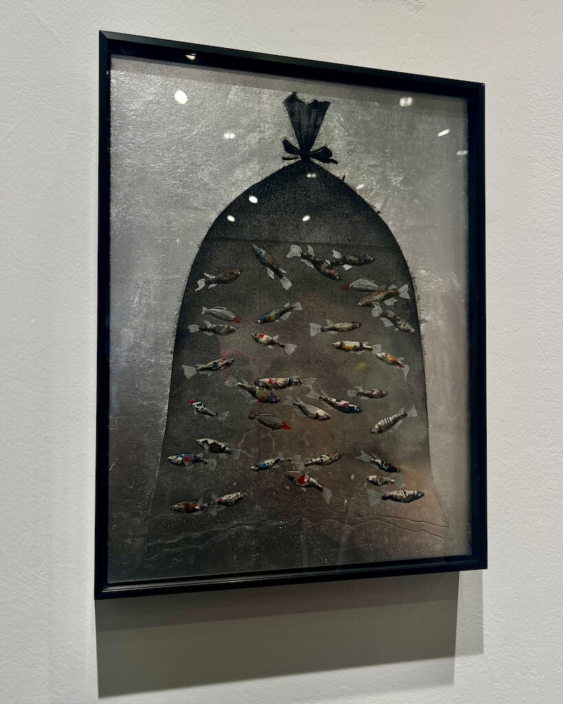 來自臺中的大雋藝術,展覽範圍涵蓋國內外藝術家,呈現從東方當代到西方藝術語系的多元風貌。本次參展的日本藝術家白田誉主也( Hakuta Yoshuya,b. 1984 ),擅長將傳統膠彩技法與當代素材融合,包括和紙、寒冷紗、金箔、銀箔與落水紙等,構築出細膩而層次豐富的視覺語言。其創作多以動物為主題,透過擬人化筆觸與紋理細節,賦予牠們「平安」「幸福」「繁榮」等象徵意涵。除光明與希望意象外,作品〈竜宮城〉與〈學校〉更展現他對生命、存在與時間的深層思索—畫中海龜與魚群被限制於畫格中,報紙拼貼細節尤為引人注目—報紙作為具時效性的媒材,被用於描繪生物形象,暗示時間流動與生命受限的張力。