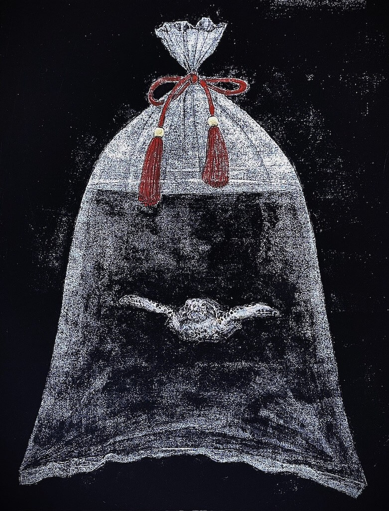 〈竜宮城〉的主題取材自日本浦島太郎的傳說—漁夫救龜入海,隨後被帶至龍宮城。故事中的海龜象徵赦免與轉化之力;然而,白田筆下那被圈套的海龜,似乎永遠無法游往龍宮,成為現實與神話之間的隱喻性提問。