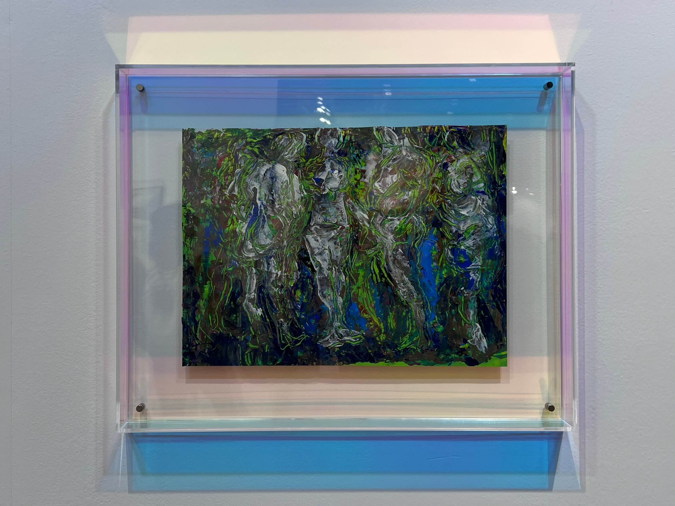 〈無題〉出自他的「色皮系列」,作品以多層壓克力顏料覆敷,再以刻刀或電鑽減去部分表層,形成鏤空的孔洞與刀痕。這種減法雕刻的技法,使畫布不再只是平面的承載,而成為可穿透的「皮膜」。當光線穿過孔洞時,影與色在畫面與牆面之間流動,形成柔暈的投影。這種處理手法,呼應了中國傳統的皮影戲—光、影、幕的三重結構被轉化為繪畫語言:顏料是皮,光是筆,影是畫。畫中的線條以螢光綠與深藍交纏,彷彿葉影閃爍於人體的輪廓之間,使形體與背景相互滲透。林墨不只是描繪光,而是讓光本身成為創作的主體,讓觀看如同一次皮影戲的演出—虛實並生。
