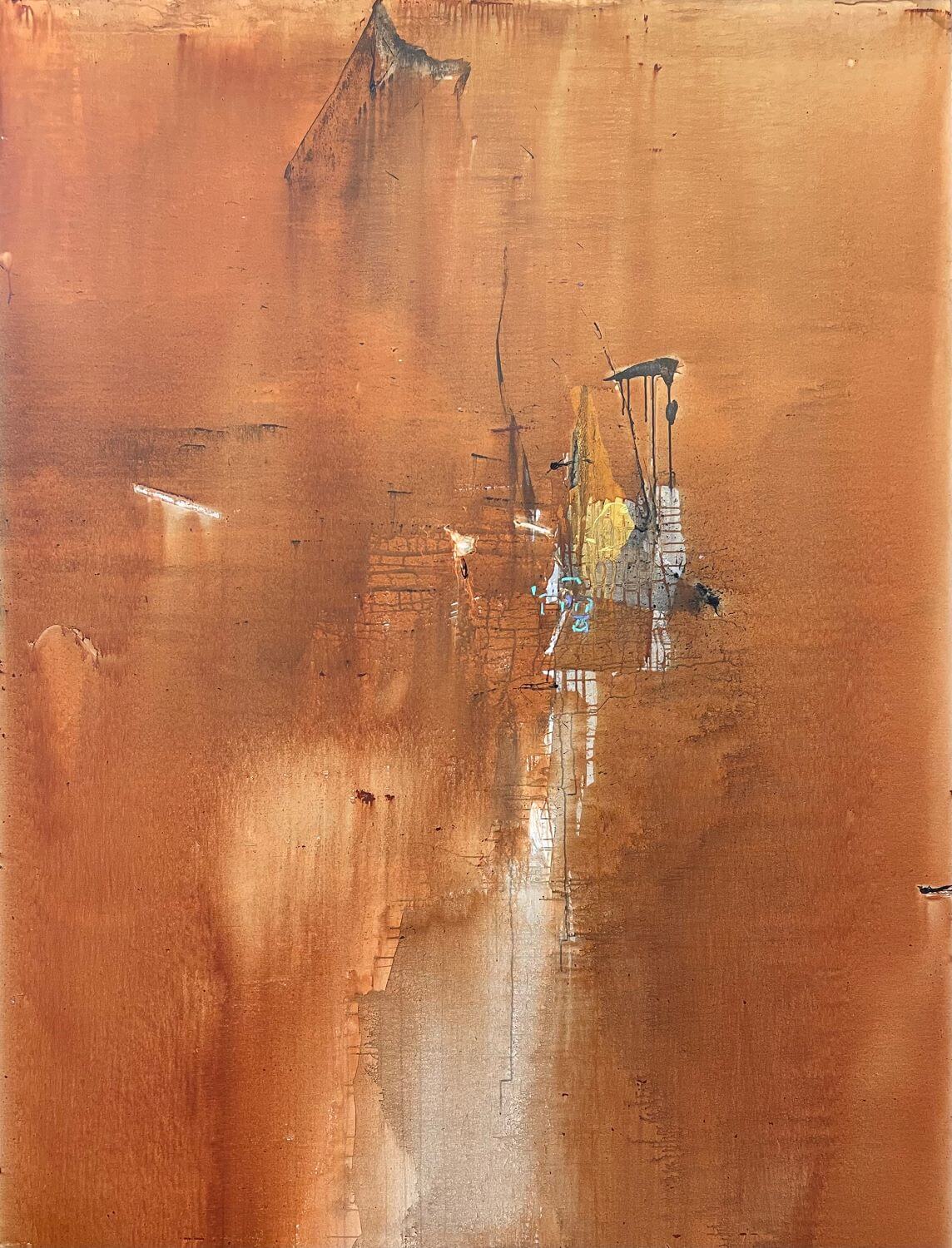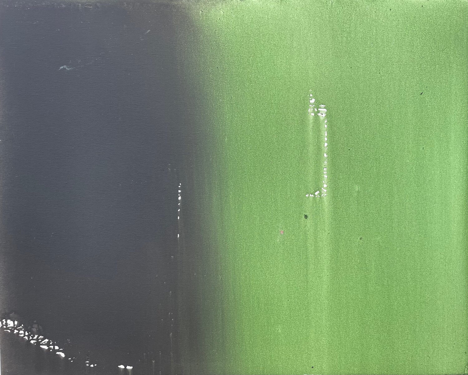 有些作品,從我一位經常夜間微拜訪的酒客的經驗看來。像是鏡頭拉開落地窗於林間的光暈,天南地北的語句在暗夜裡,飄散著閒暇或柴米油鹽。背景是單色的無限層疊,黃光溢出落地窗暈染著樹木的輪廓。淋酒時光的話語,被一字字挑開,橫豎撇奈被拆解成透著顏色的點線,話語意義被畫筆刷成帶著氣氛的線條,或是點狀的情緒節奏。或是,在臉書上訴說著那一張他烈日下,他揮汗割推著割草機,處理連下了一兩星期以來乘著風可以成浪的草皮。草坡起伏,草皮綠成了層次豐富的深邃背景。陽光在樹葉間落下了斑駁的點,緩緩移動,陪伴著藝術家剪裁著自然,在草皮上一點一線地皴點著豐滿的情緒線條。