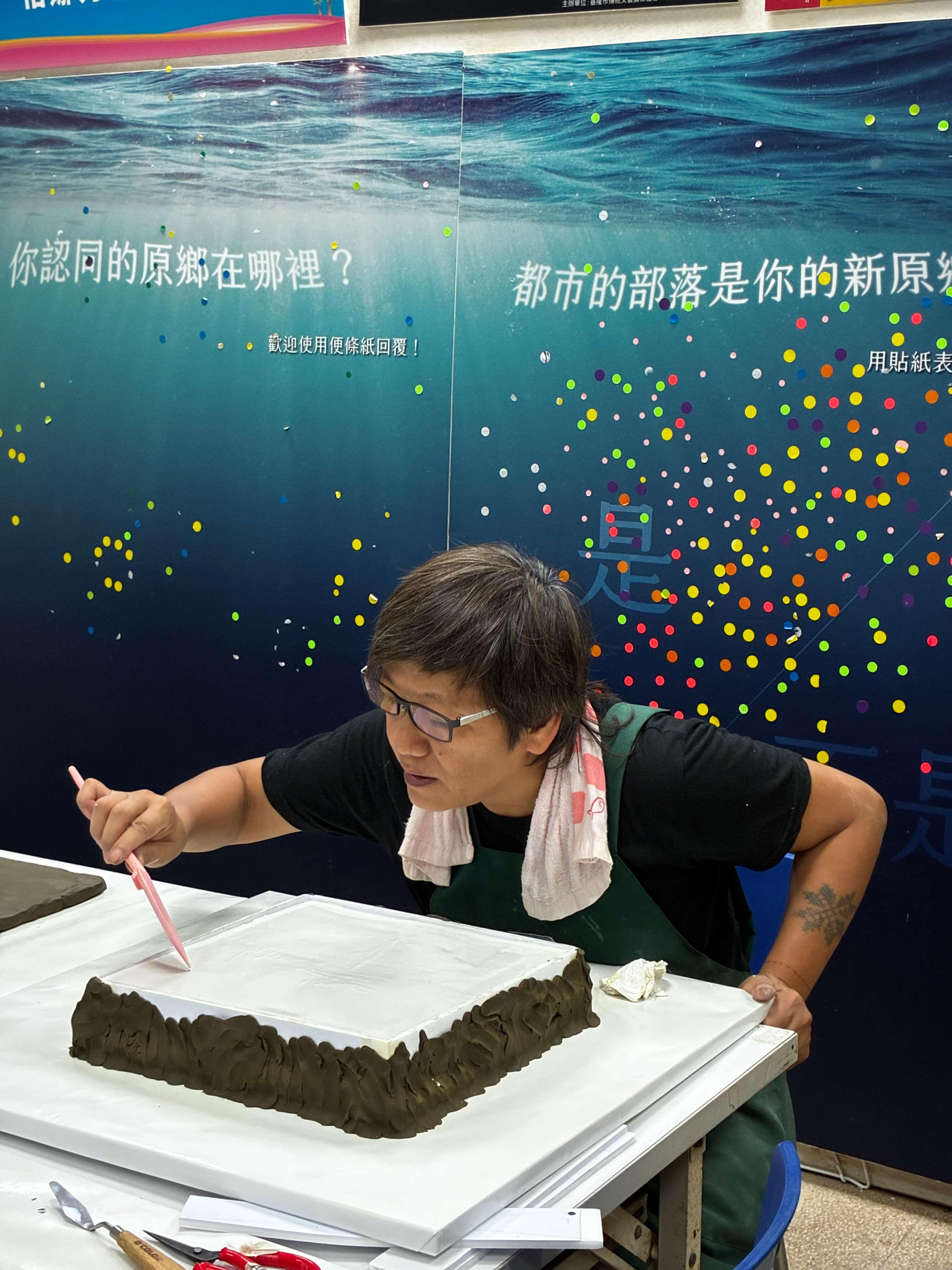 任興淳倚著欄杆,將相機對準了海,我朝著他視野望去,那一片海風平浪靜、烏雲壓地極低,另一廂張恩滿正細細介紹著她和奇浩部落共作的作品。